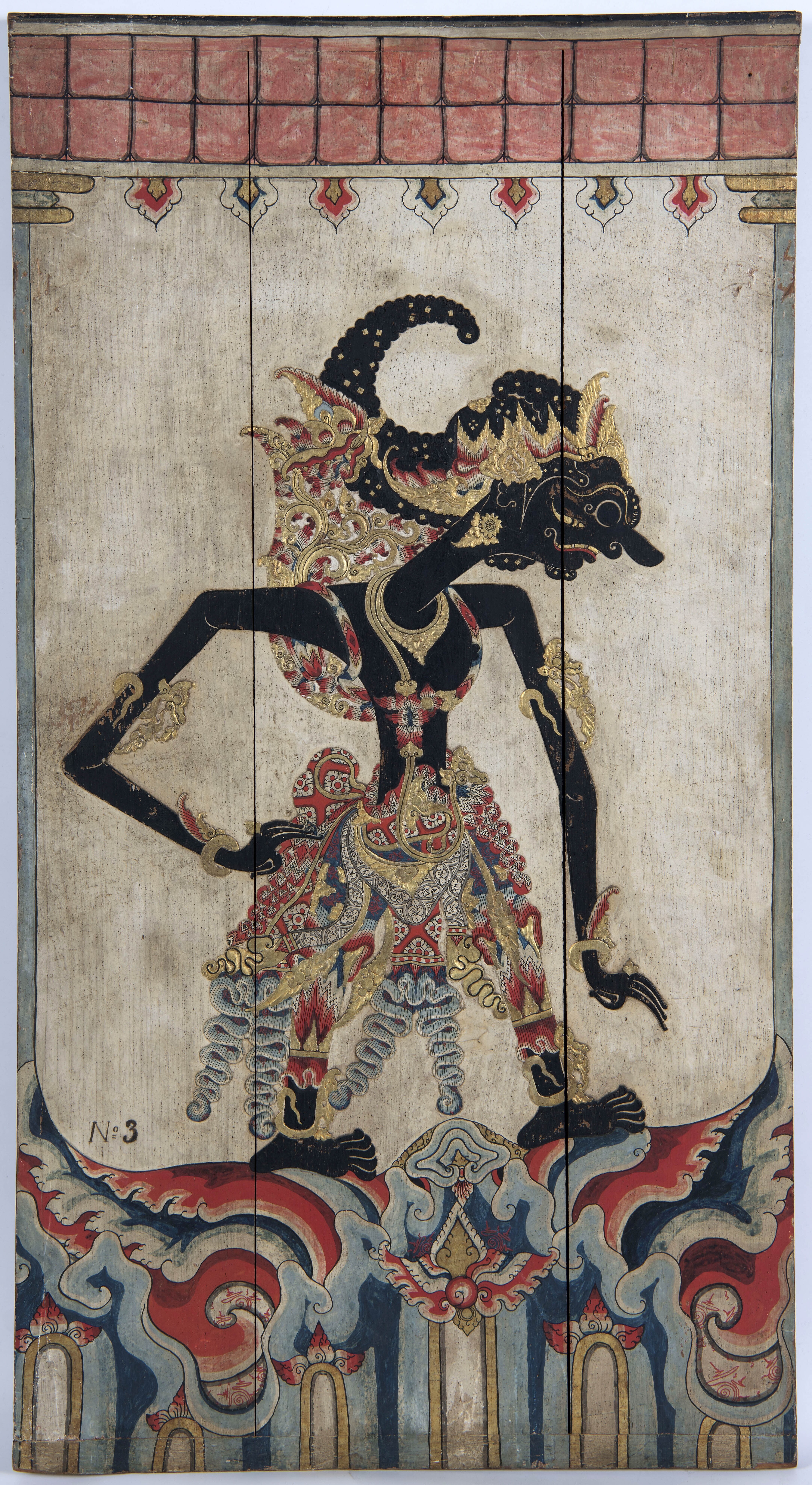 Houten bord waarop uitgesnlen de wajangfiguur Gatot ...