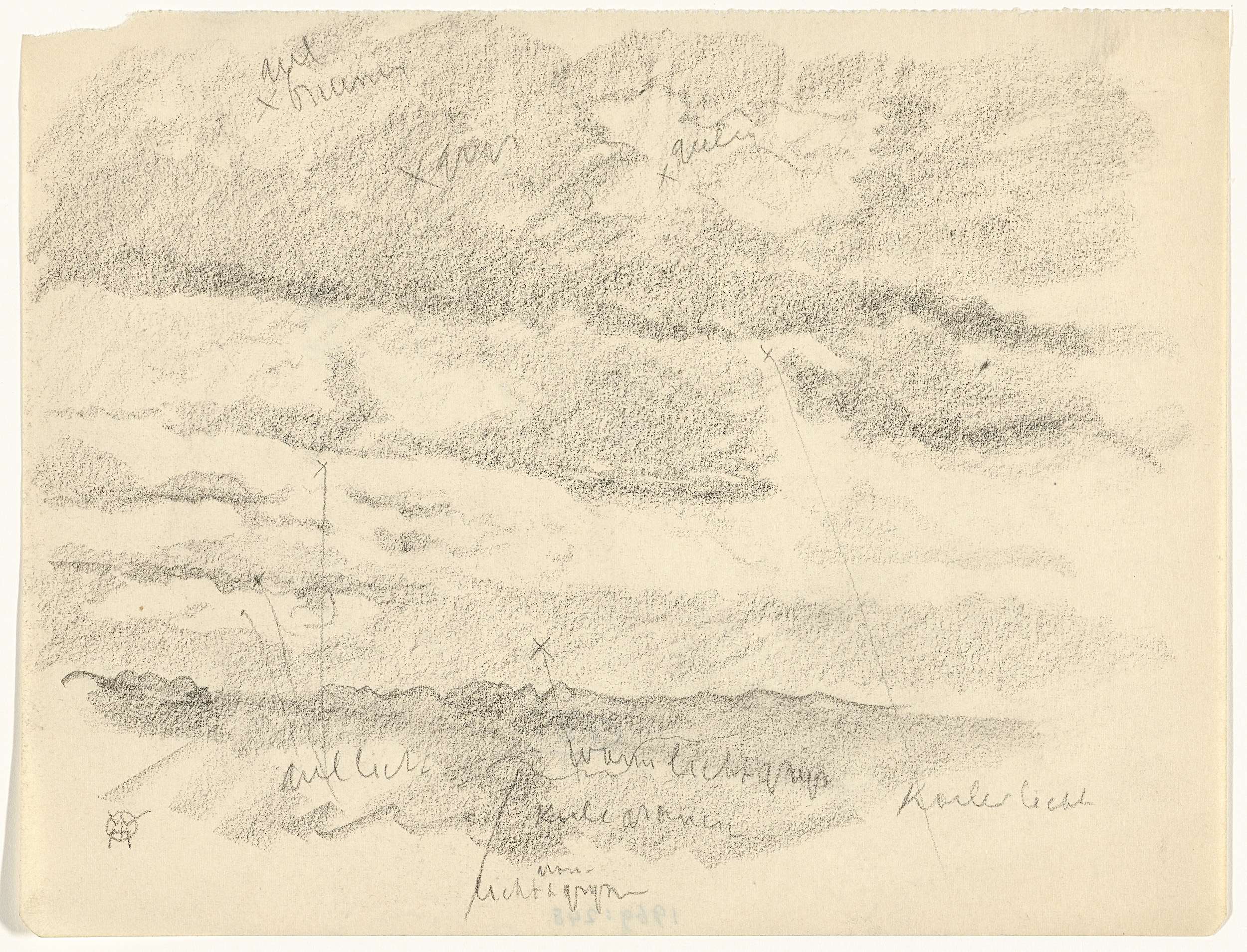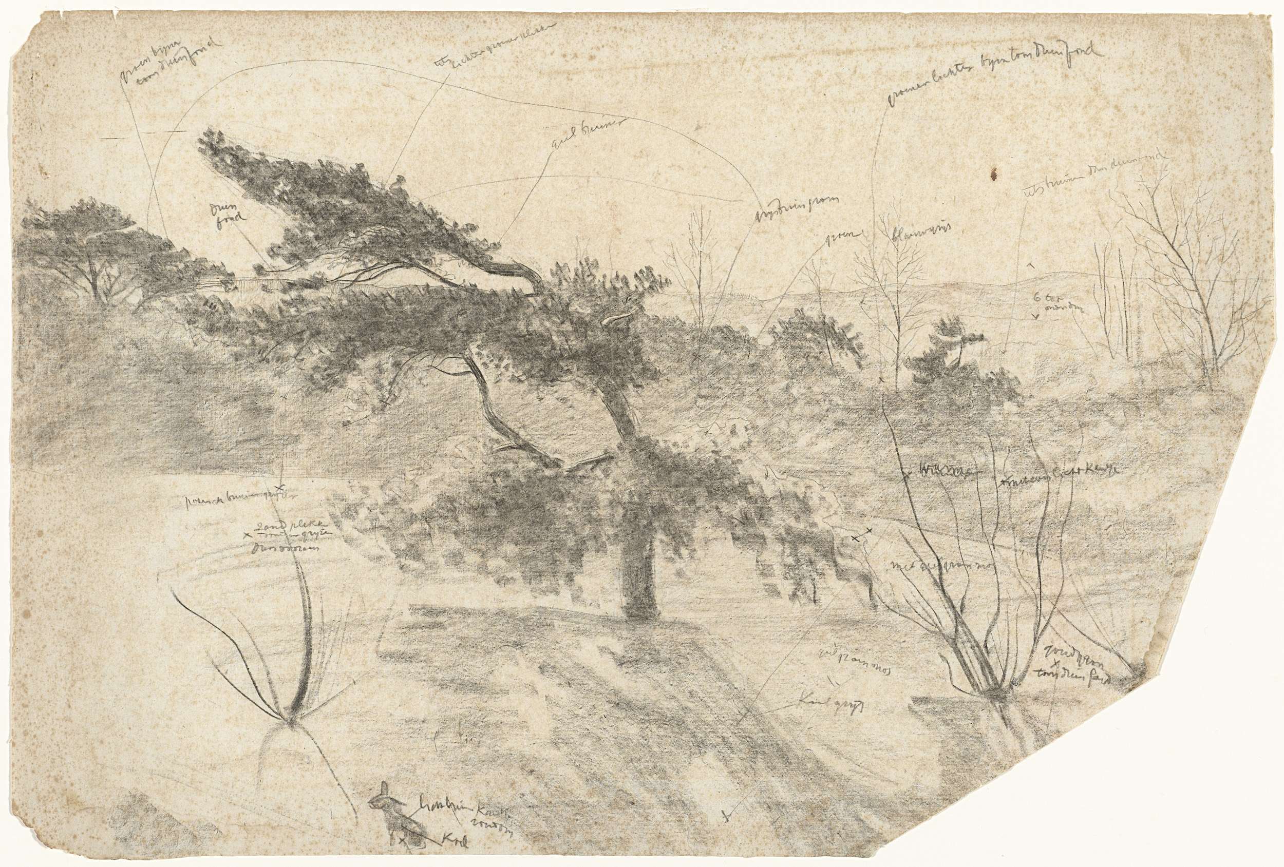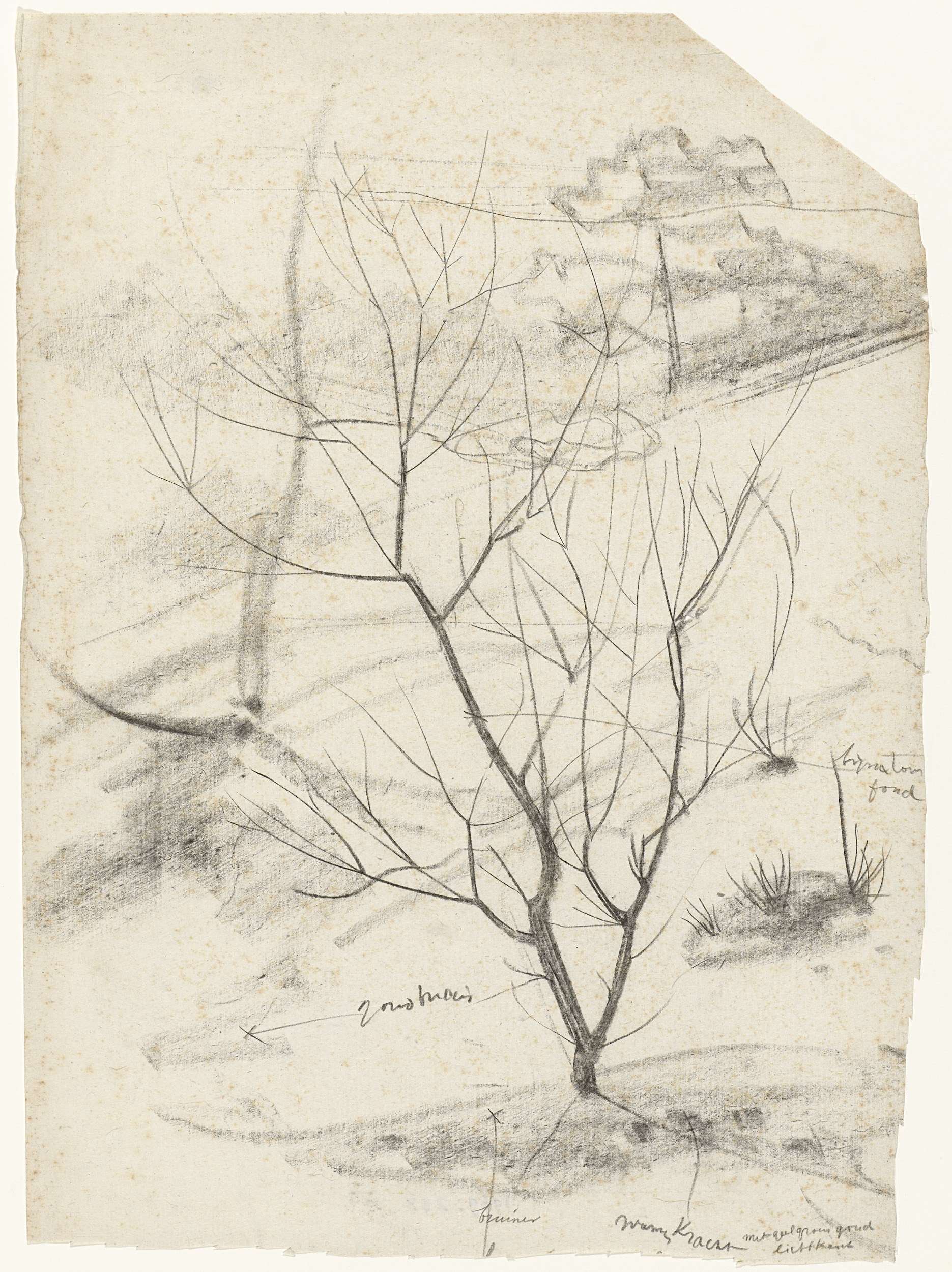 Landschap aan de voet van een heuvel, met kleurnotities