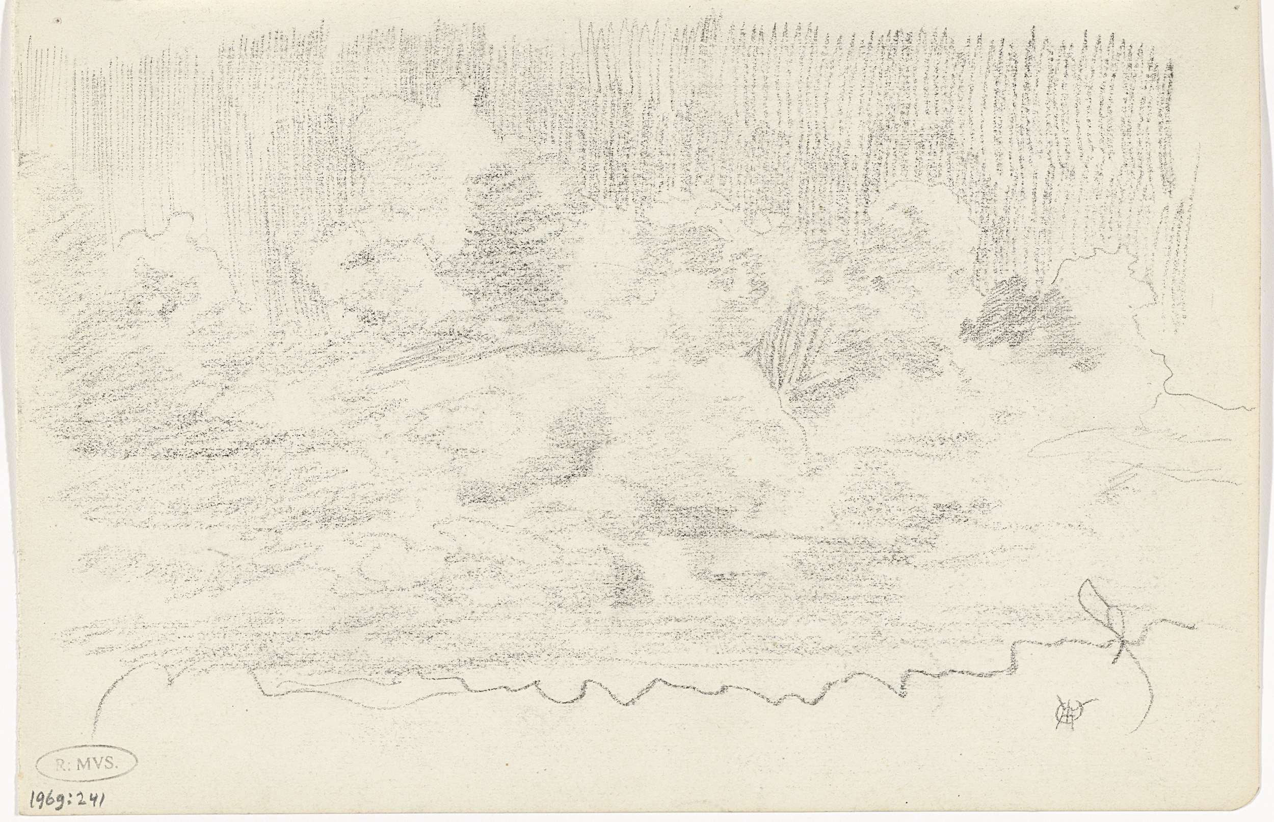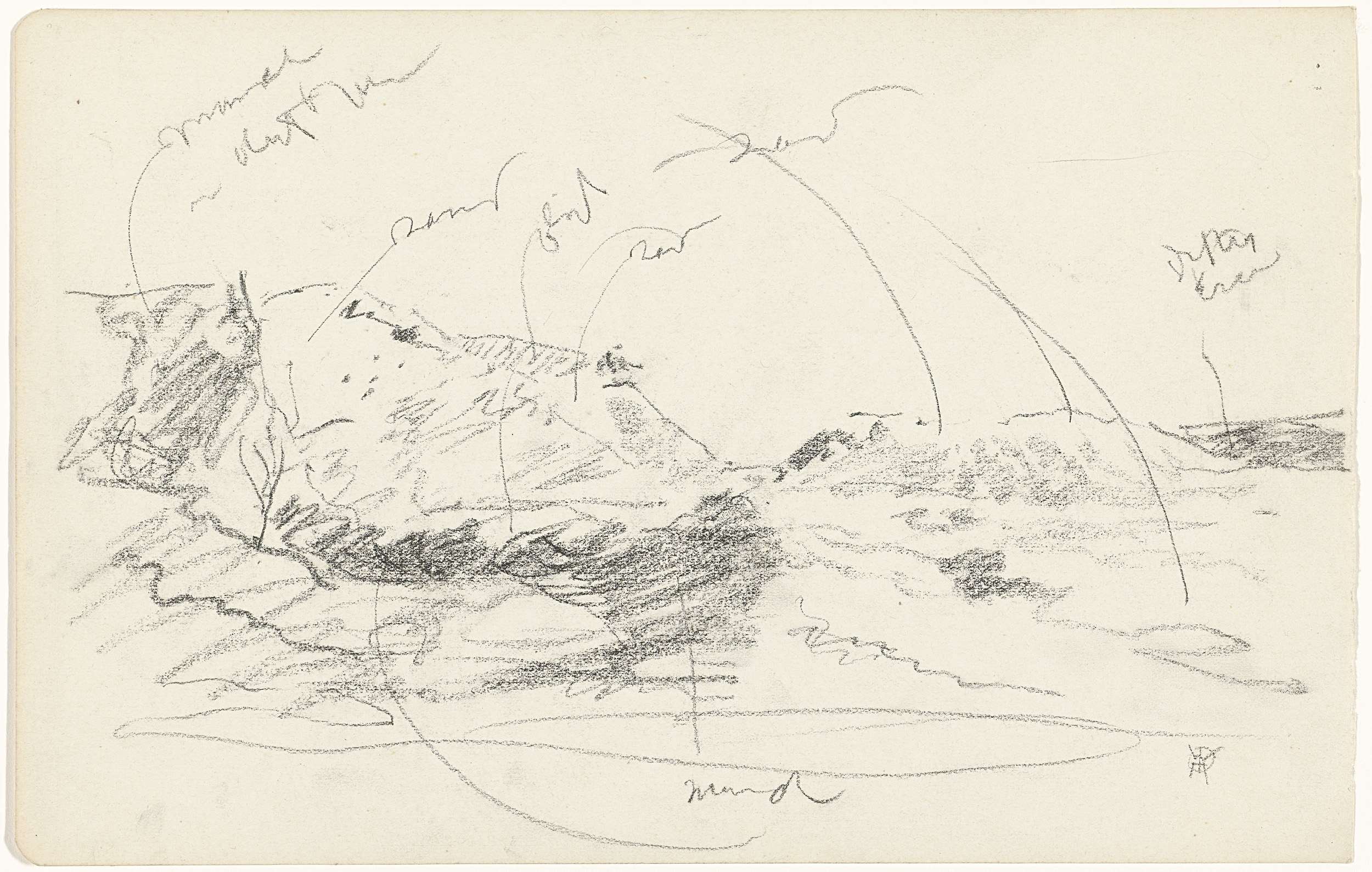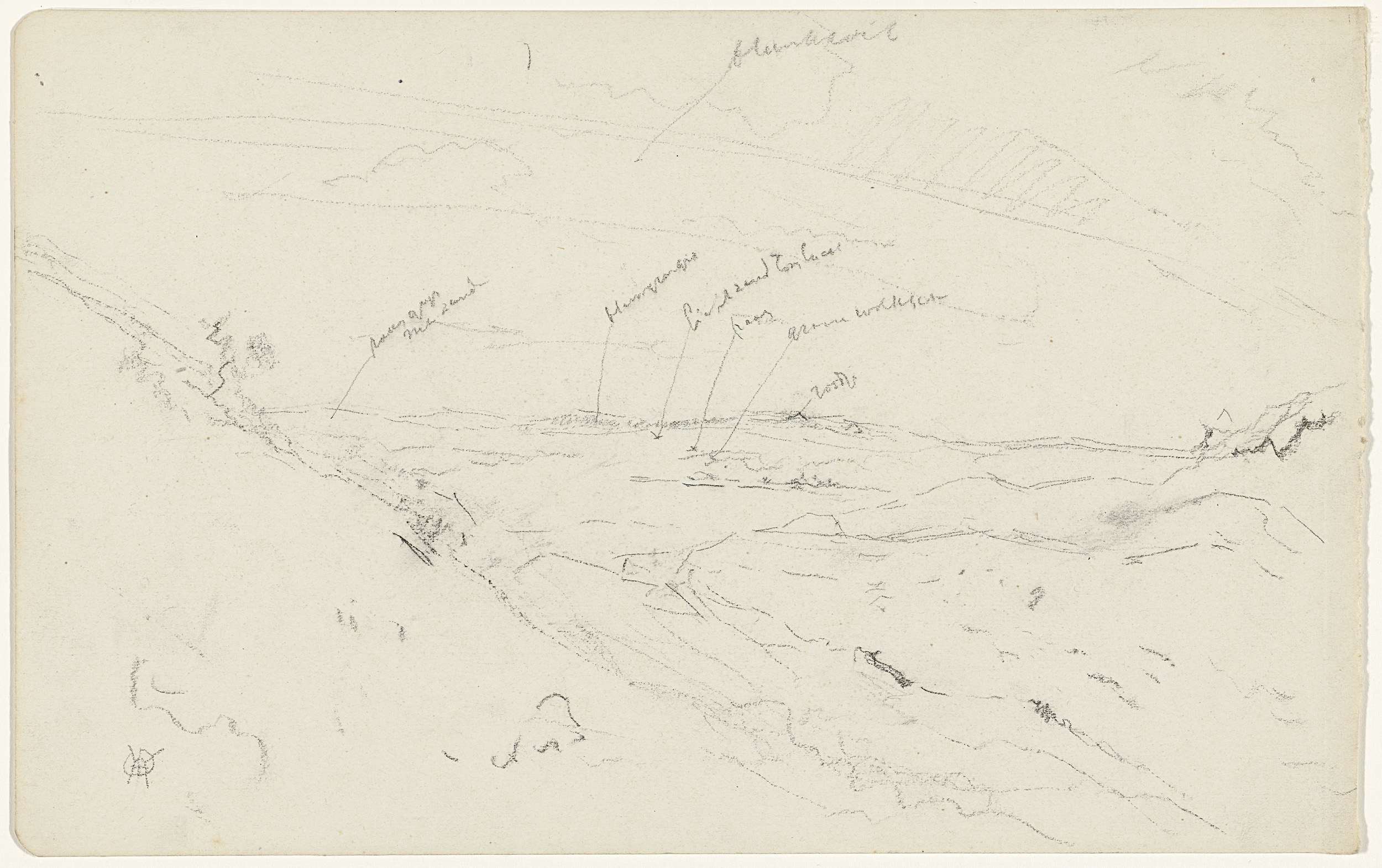 Landschap aan de voet van een heuvel, met kleurnotities