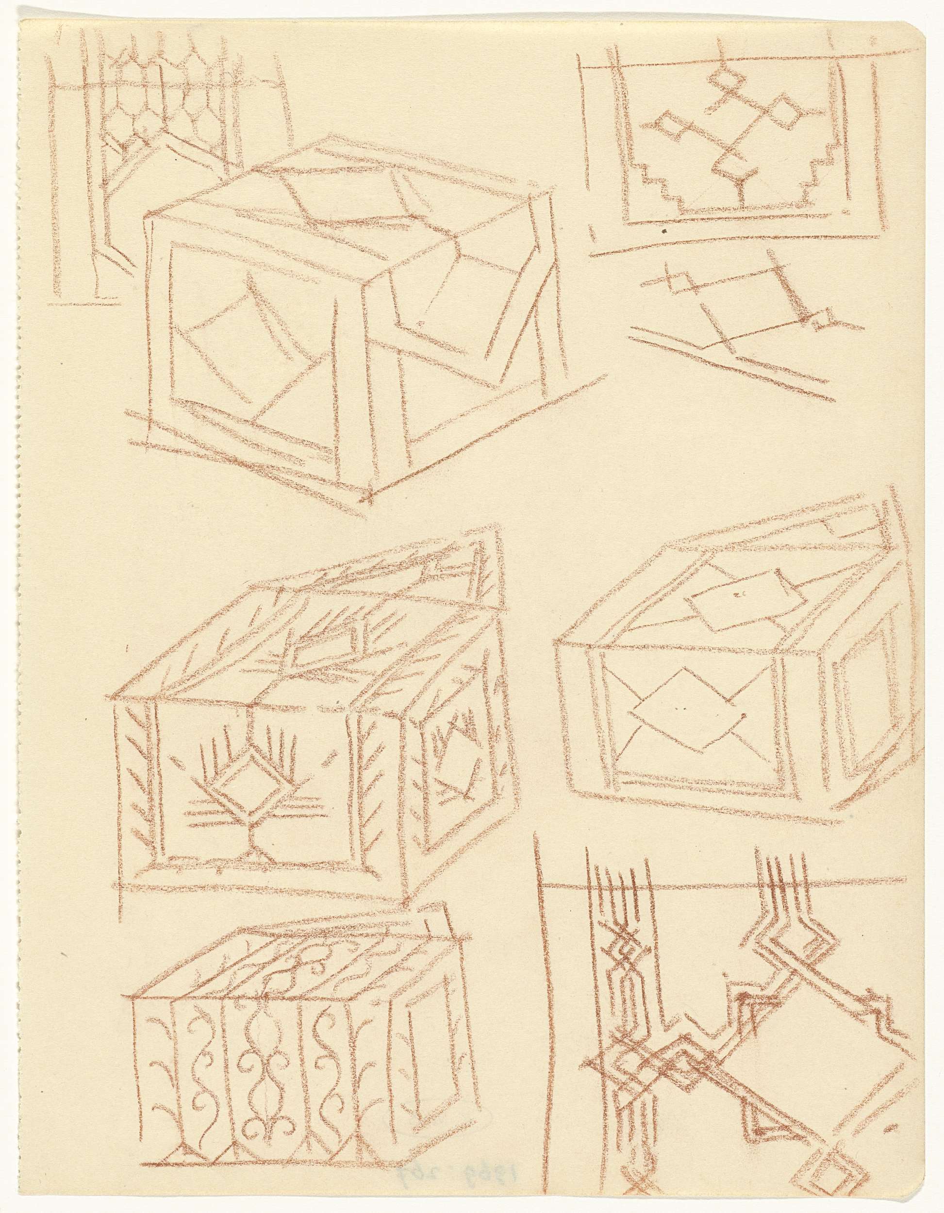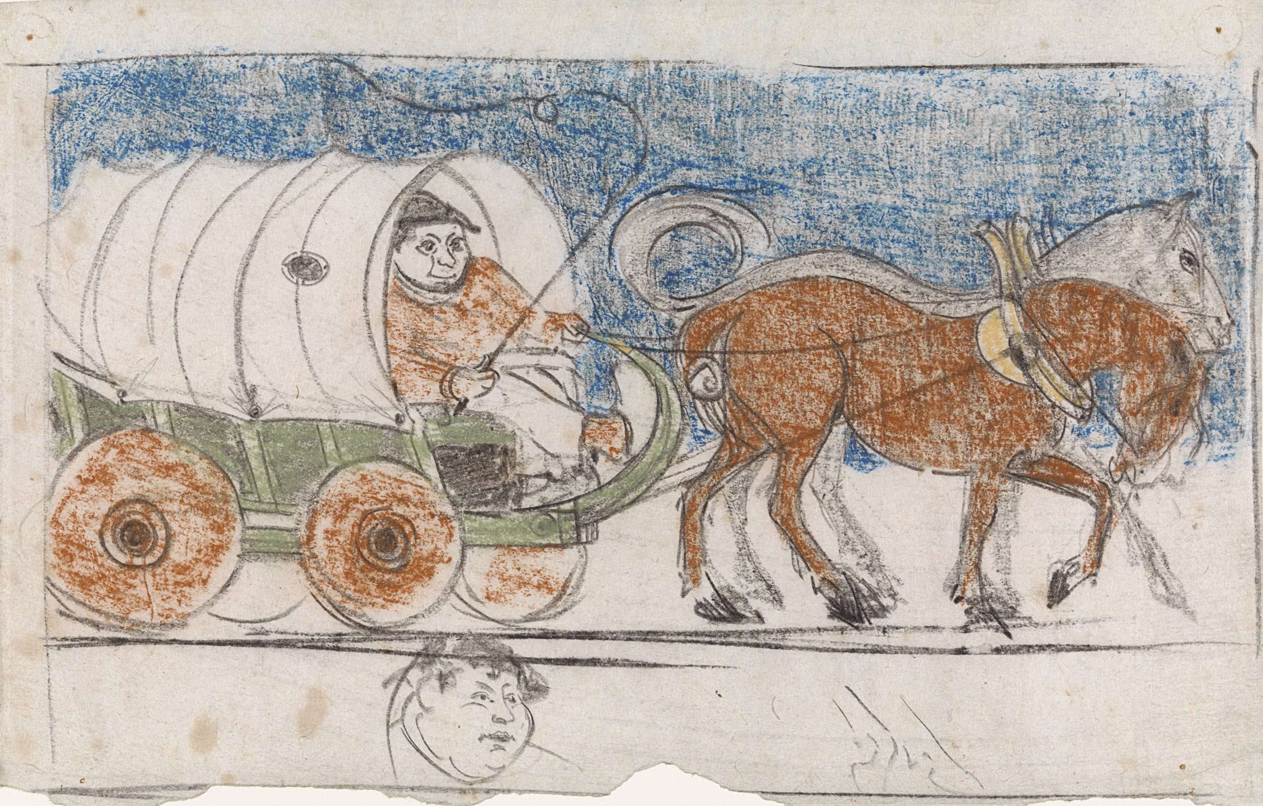 Studieblad, onder andere met figuren en een haan op ...