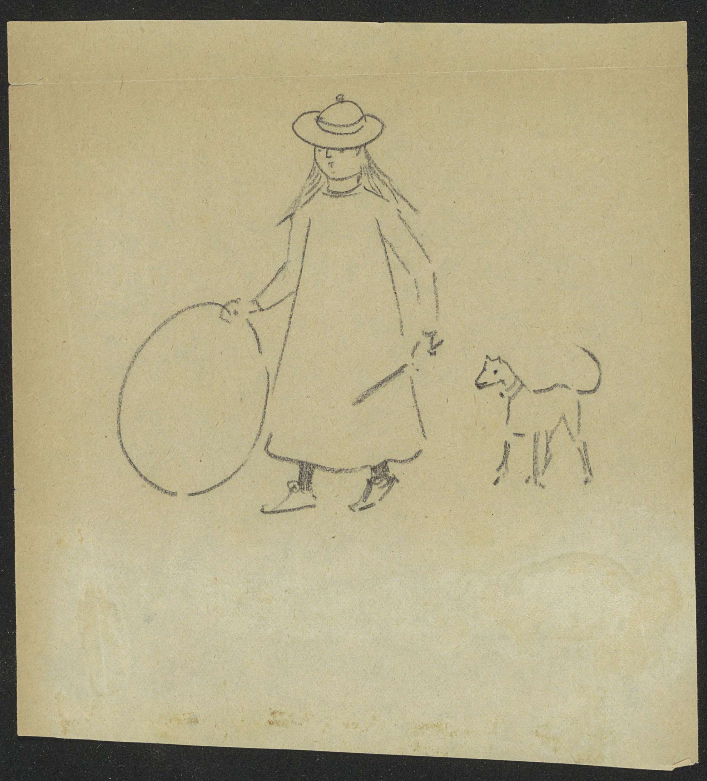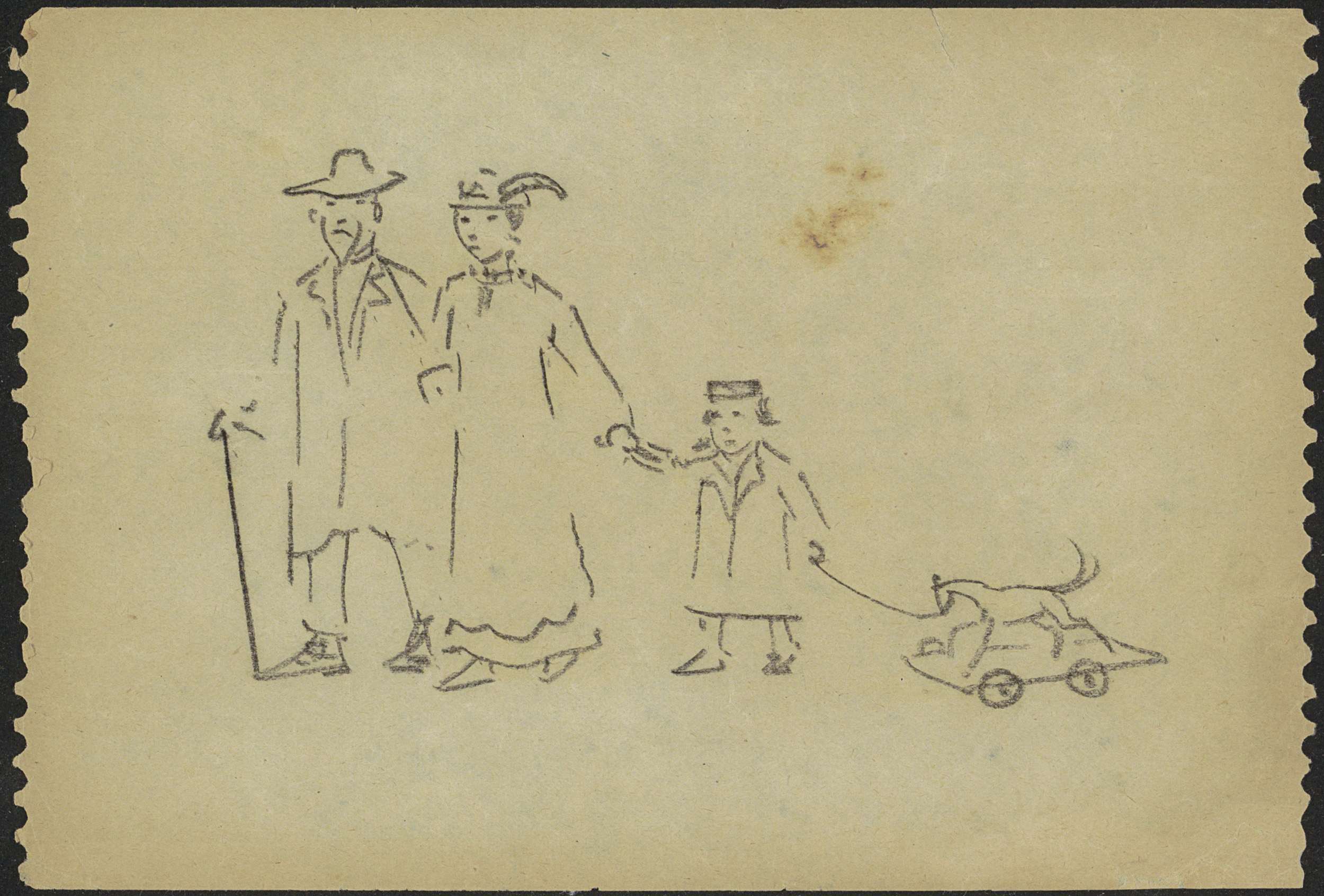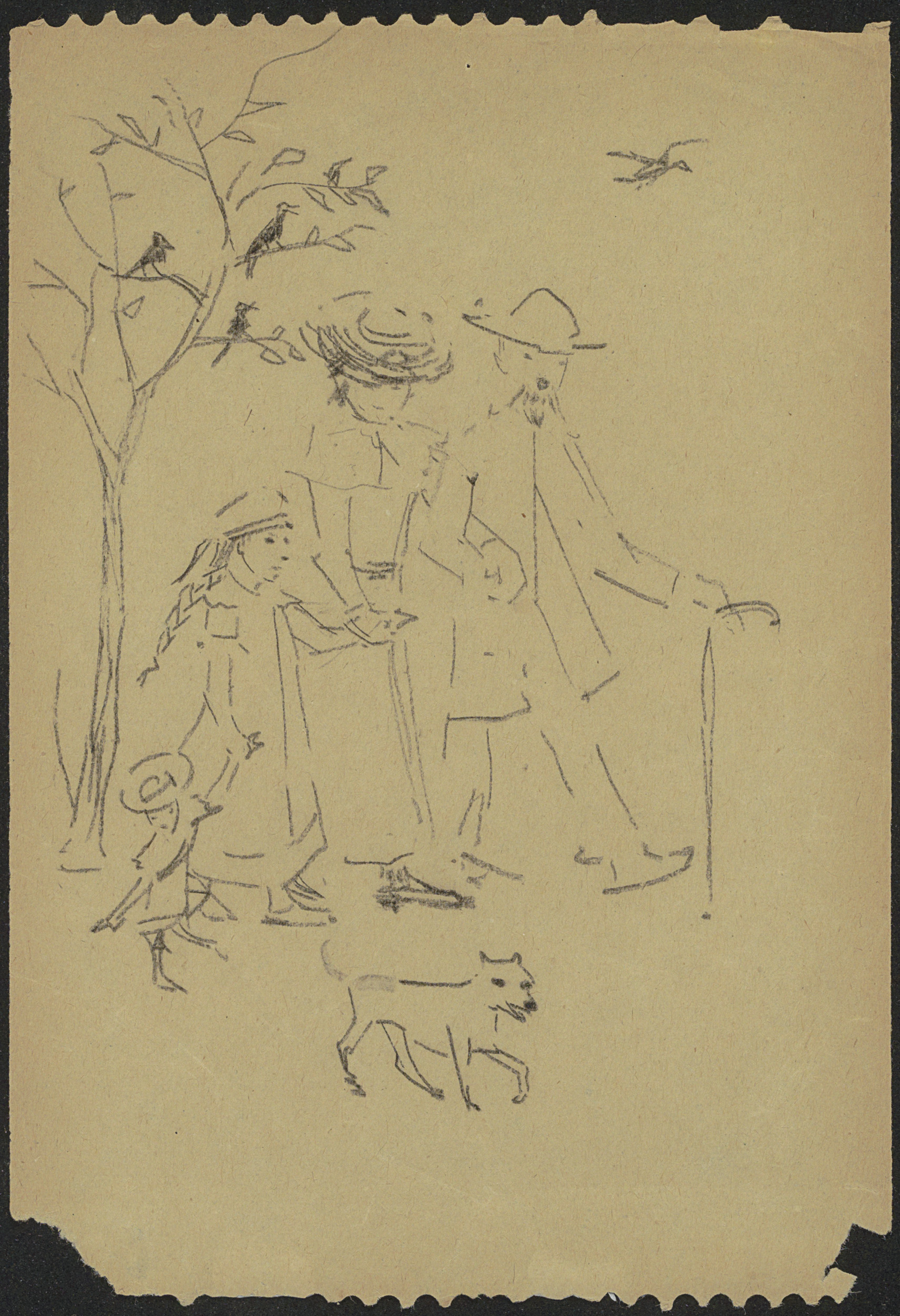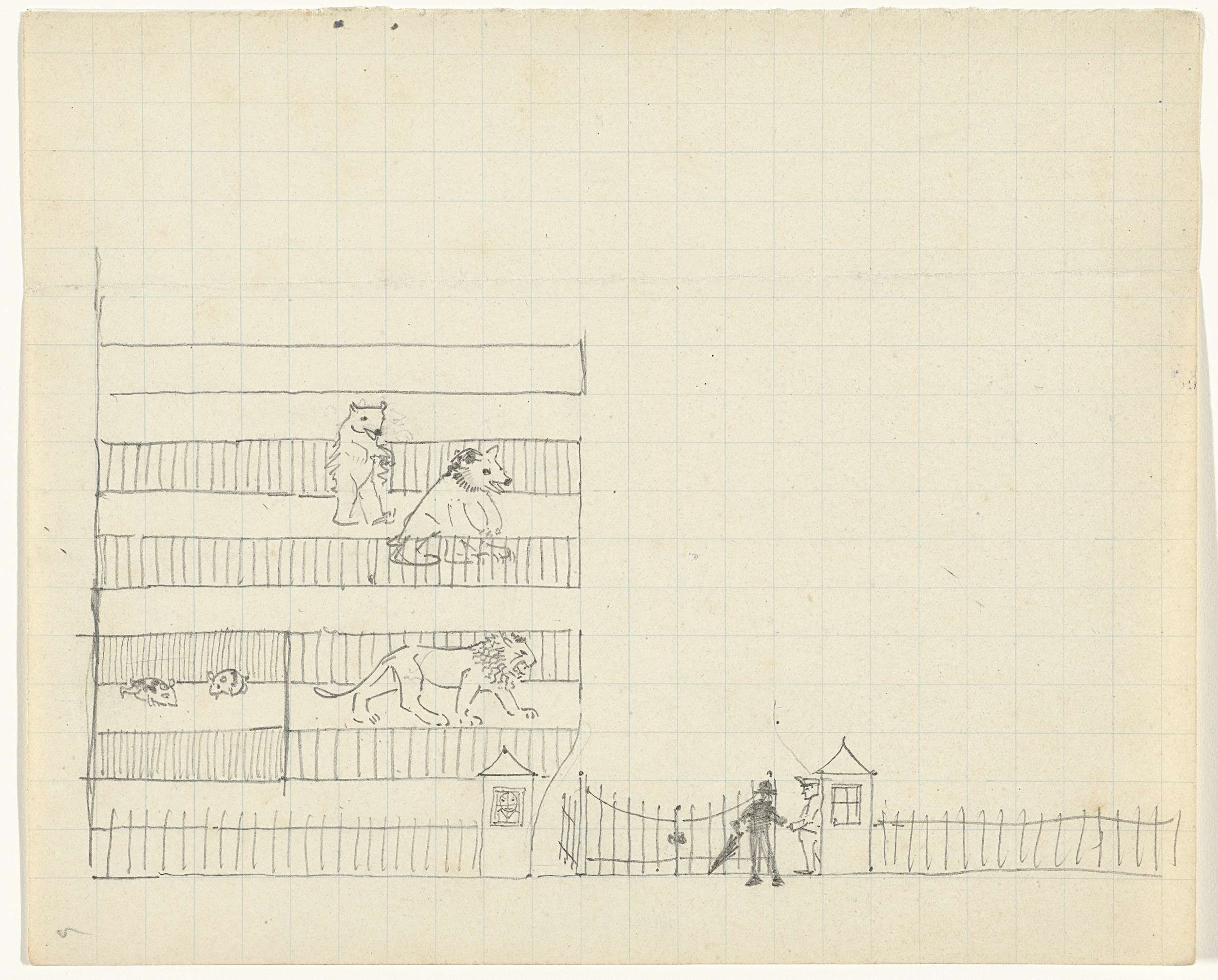 Studieblad, onder andere met een wandelend paar, kat...