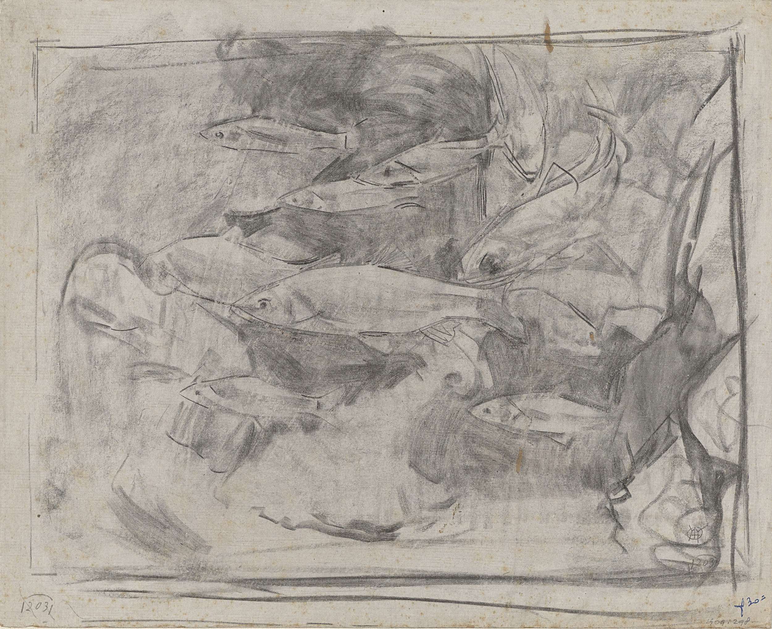 Uitgewerkte studie van het hoofd van de zittende vis...