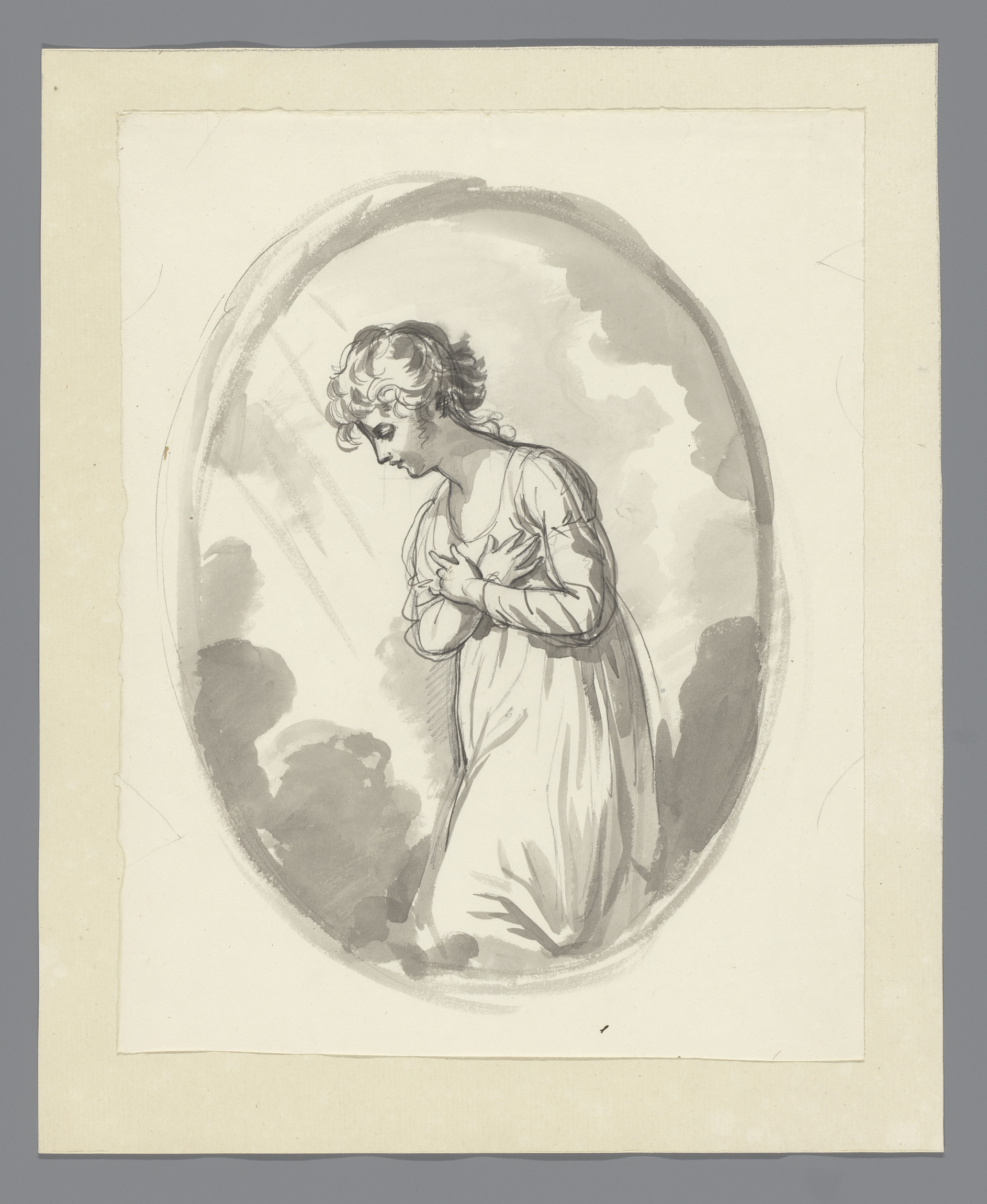 Geknield meisje, met de handen voor de borst, in ovaal