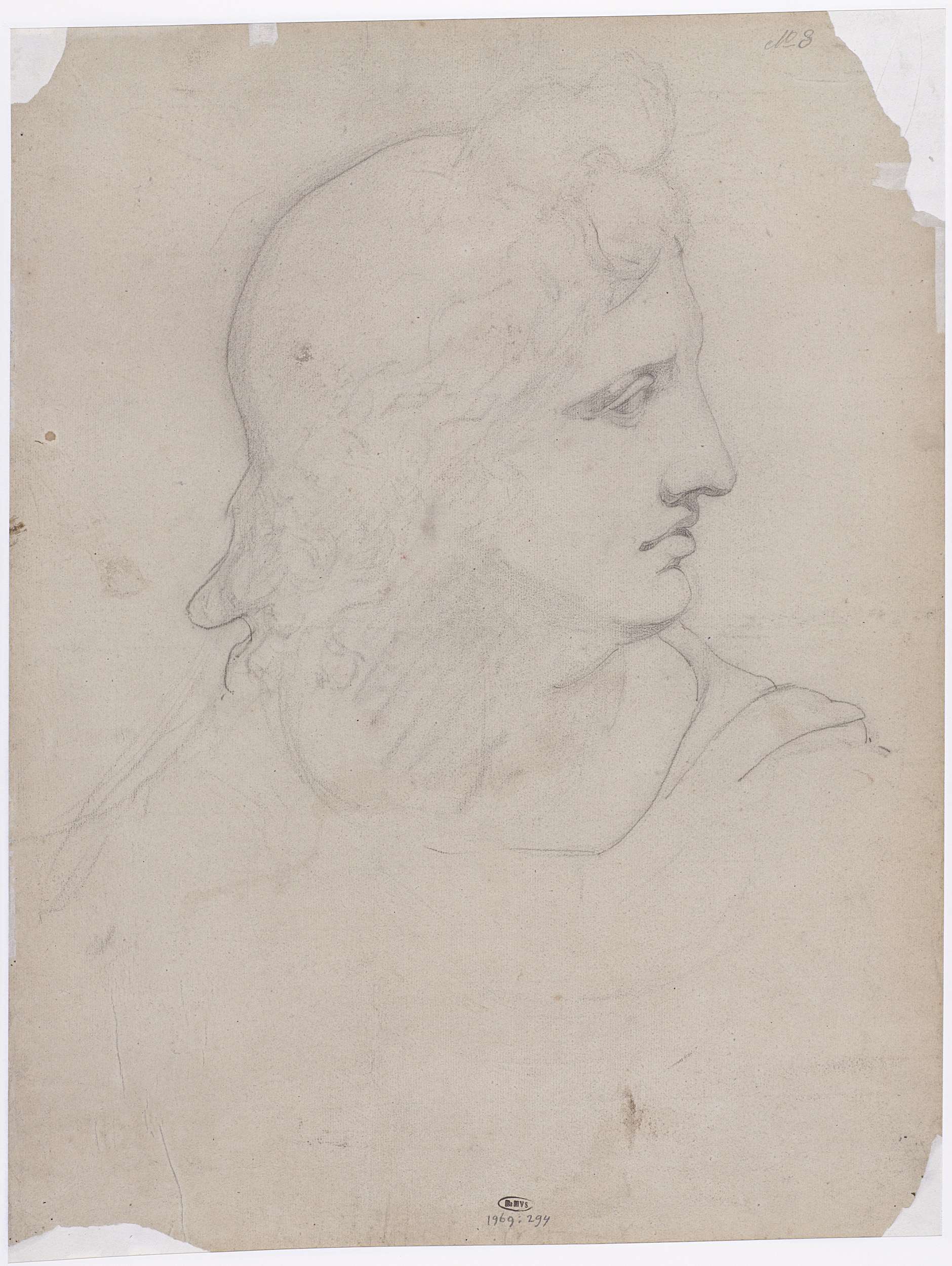 Manskop met krulhaar, in profiel naar rechts