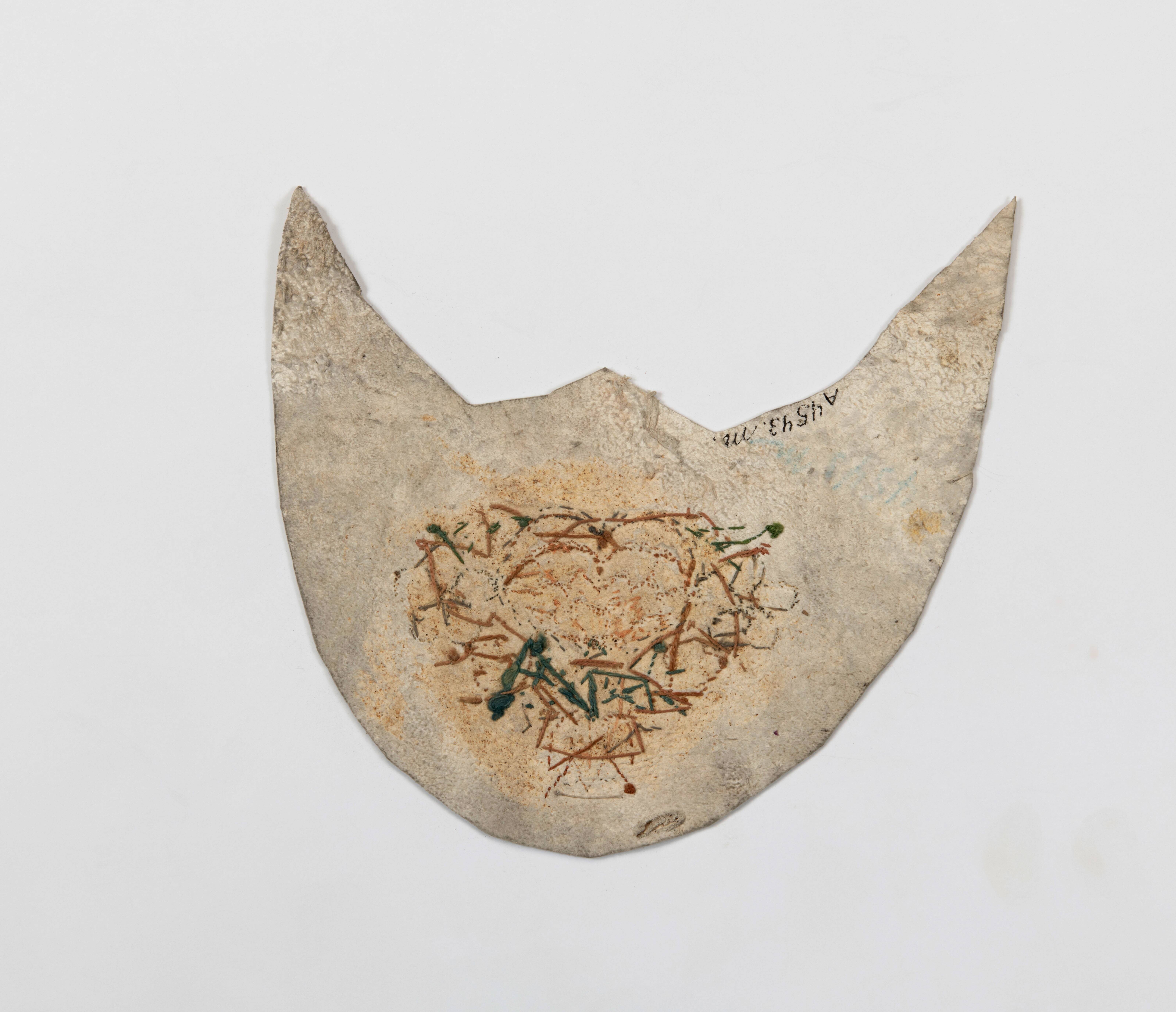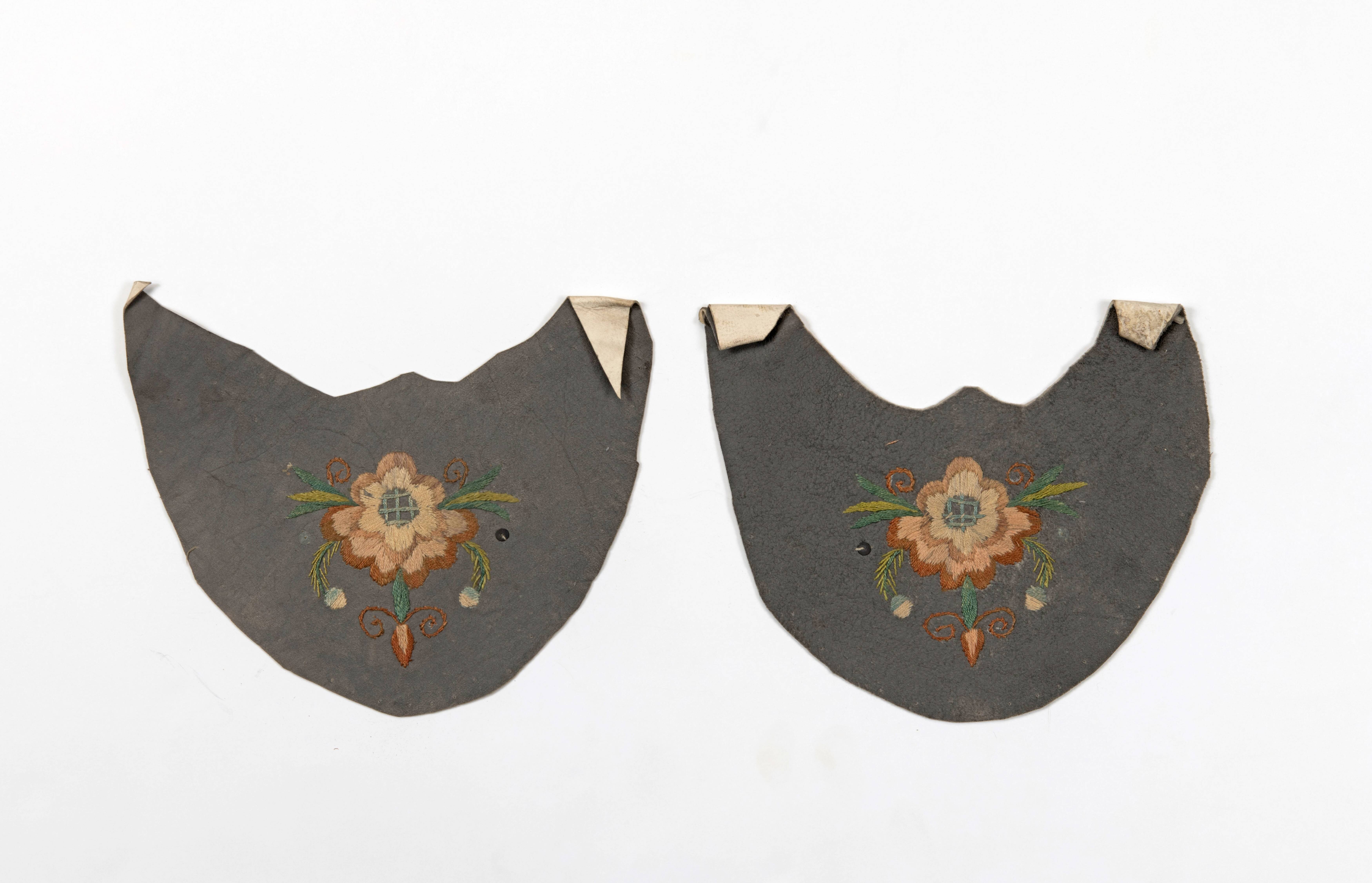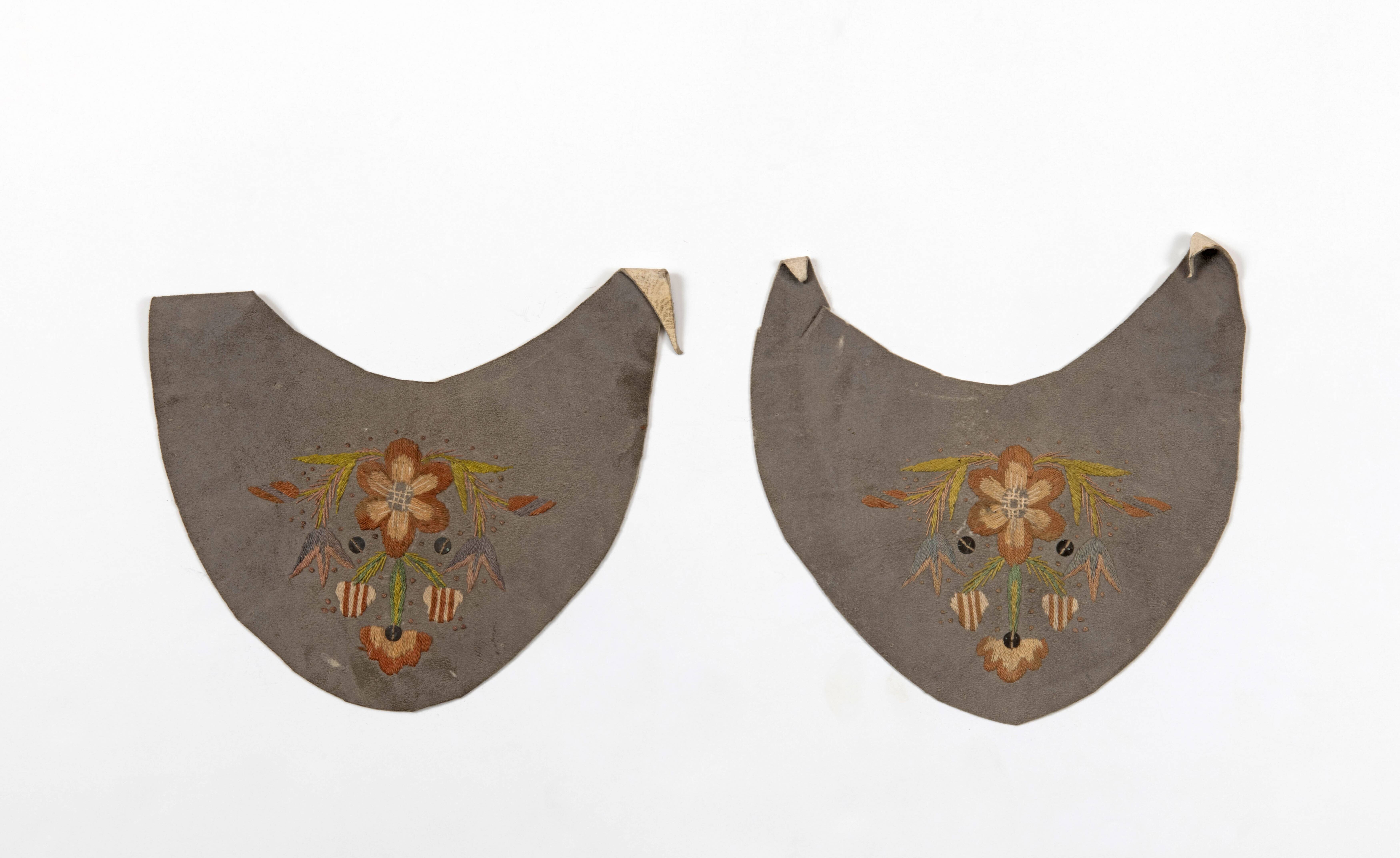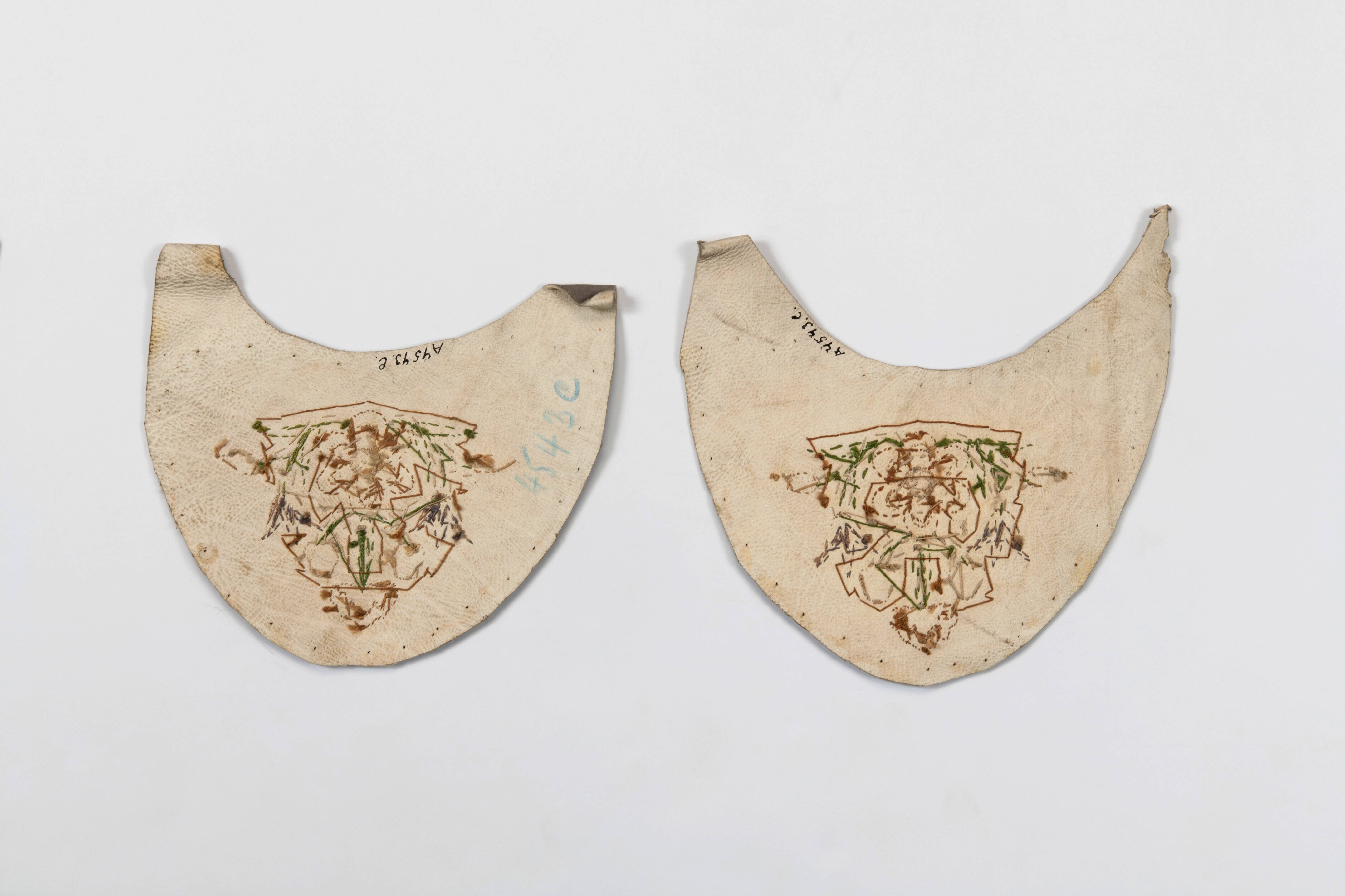 Paar geborduurde leren voorstukken van een muiltje