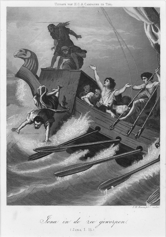 Gravure, voorstellende Jonas die in zee geworpen wor...