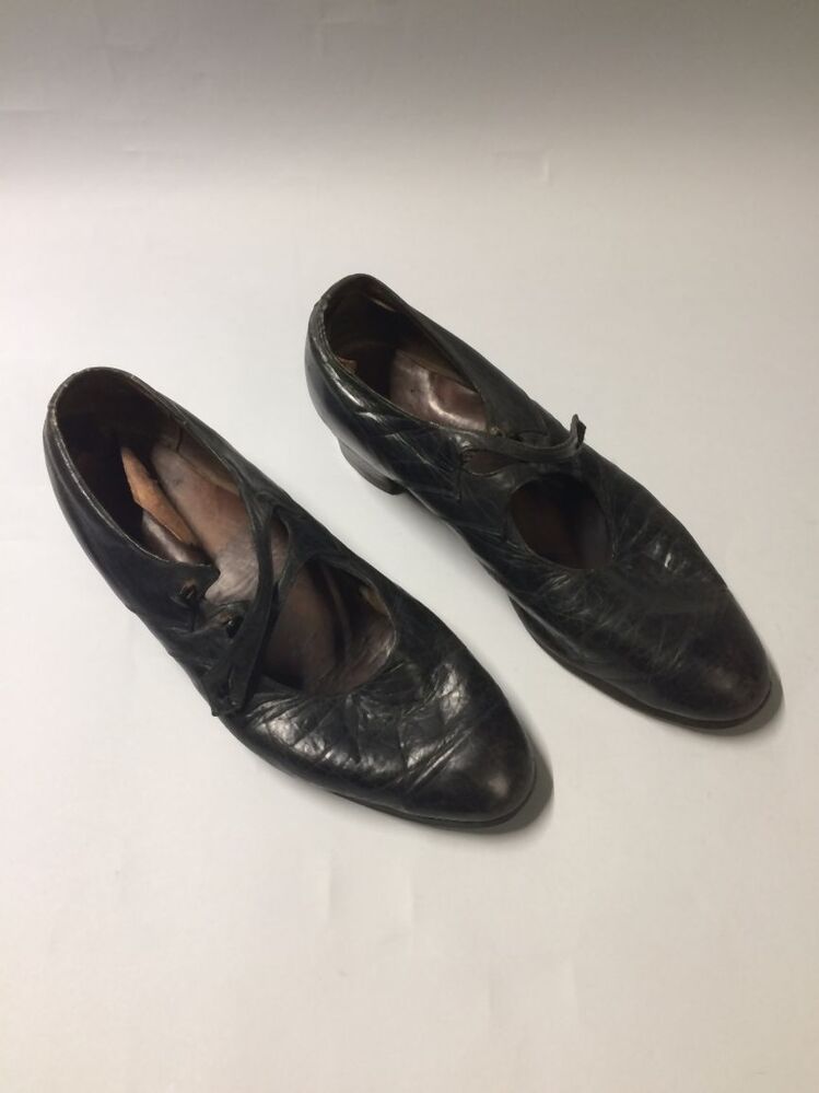 Paar zwarte damesschoenen met kleine hak en dubbele ...