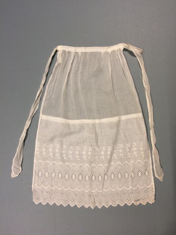 Theeschortje van wit batist met brede broderie rand