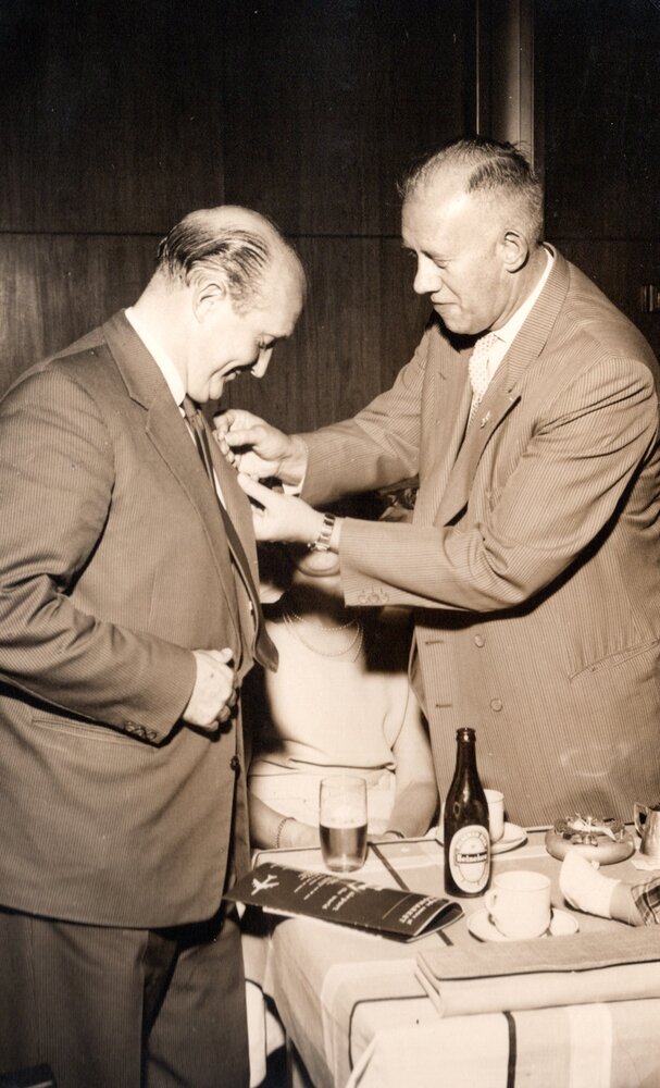 Een man wordt een speldje opgespeld