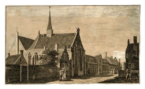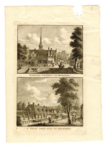 Twee gravures van het Diakonije Weeshuis en het Stad...