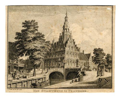 Gravure van het stadhuis in Franeker door C. Pronk