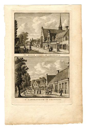 Gravure met twee afbeeldingen van de Franeker Univer...