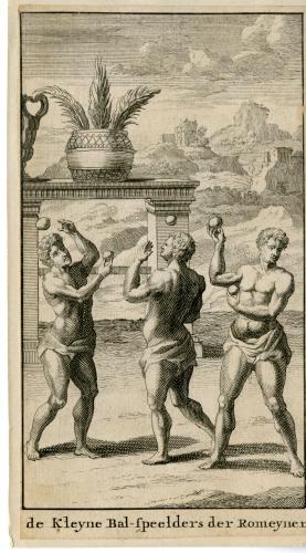Gravure van drie balspelende mannen