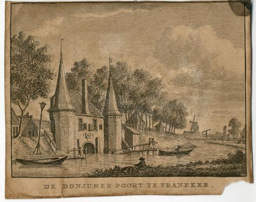 Gravure van de Dongjumerpoort in Franeker door J. Bu...