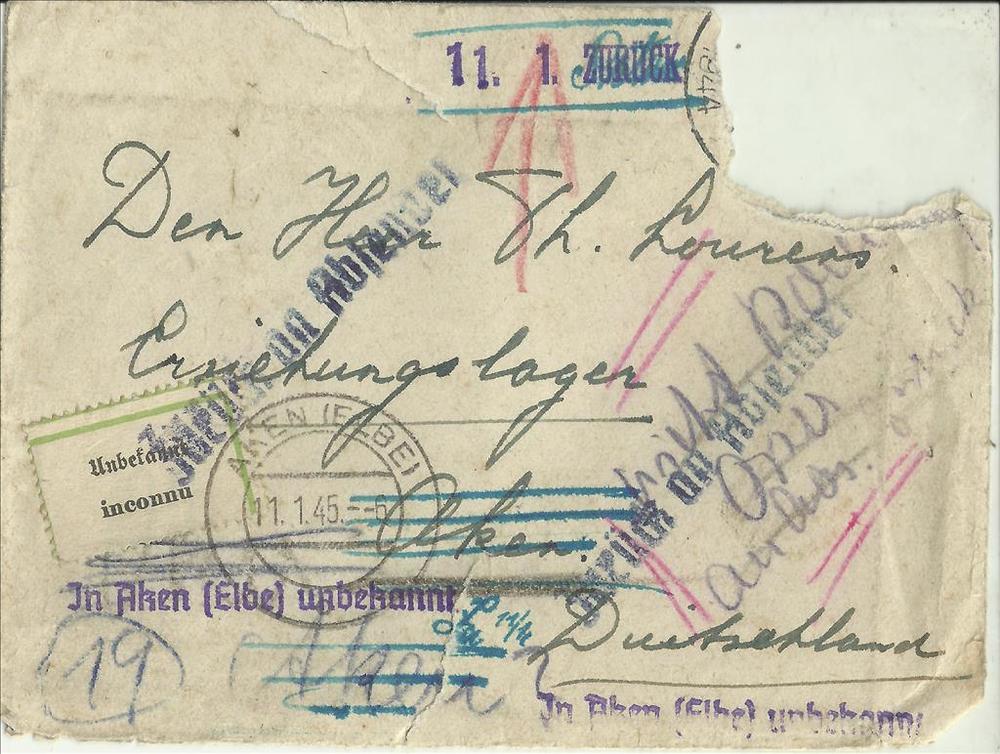 Enveloppe "aan Dhr Th Lourens Erziehungslager Aken D...