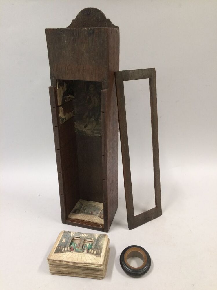 Eikenhouten kijkkast met zeven stellen van zes optis...