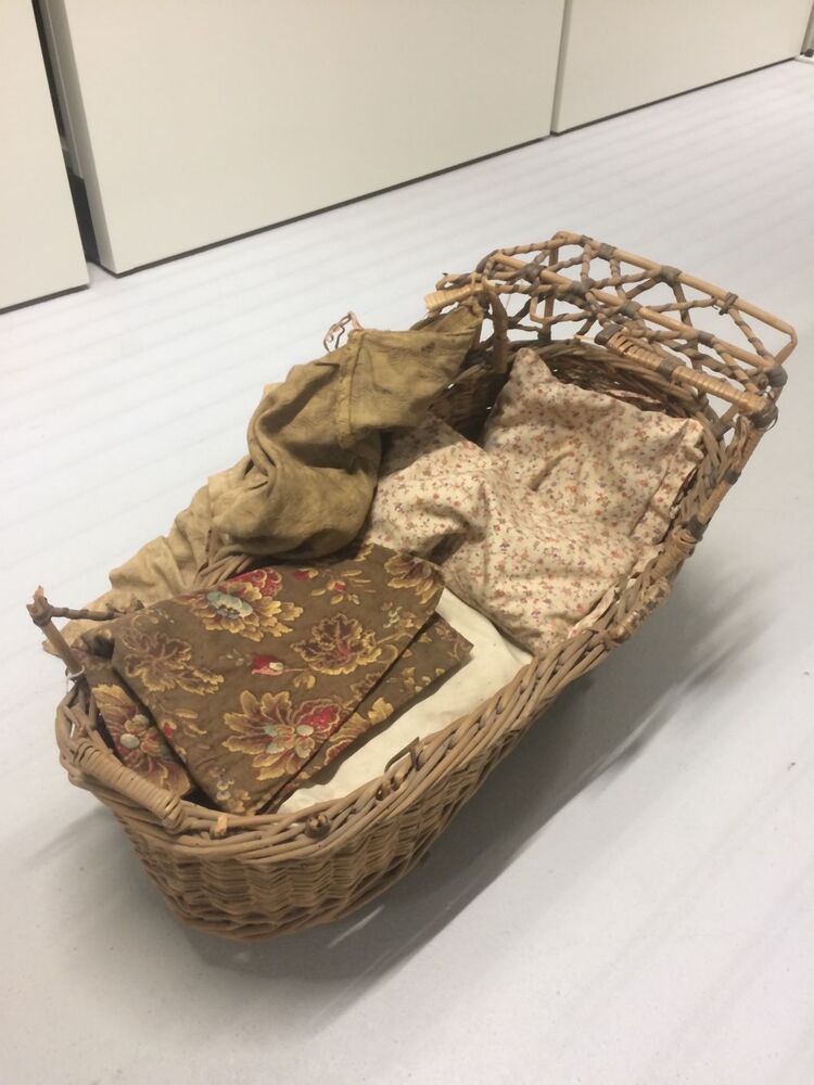 Poppenwieg van gevlochten teen met houten bodem, de ...