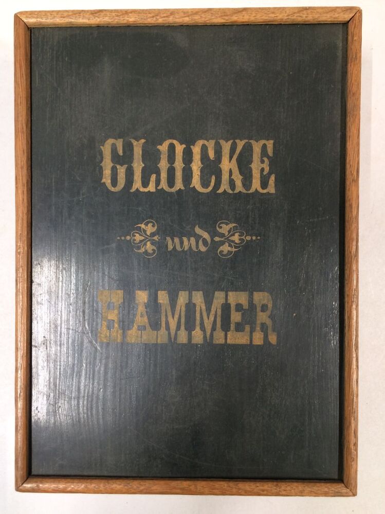 Klok en hamerspel in eikenhouten doos waarin vijf me...
