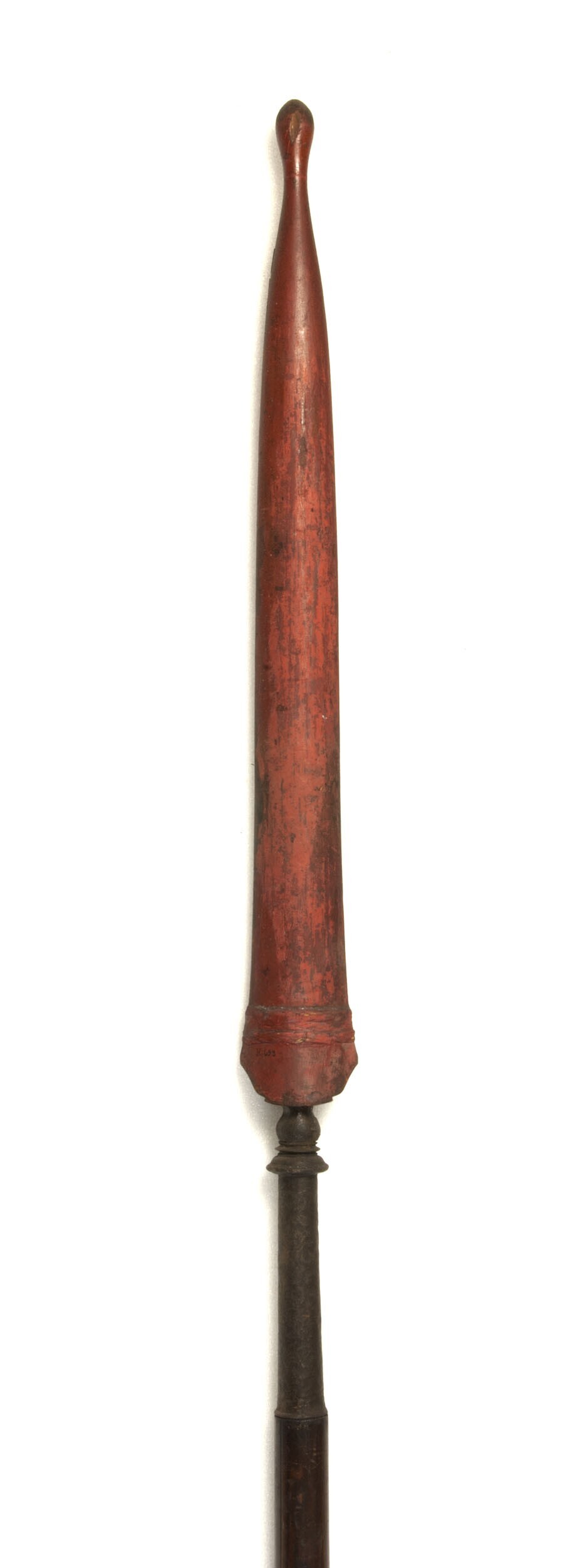 Houten lans voorzien van vlamvormige, overgaand in e...