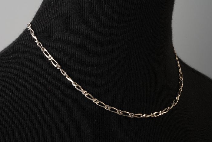 Zilveren (?) halsketting, dunne platte schakels