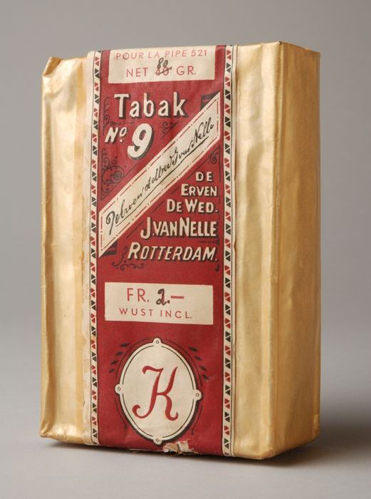 Rechthoekig pak tabak, roodbruin-wit-zwart etiket, "...