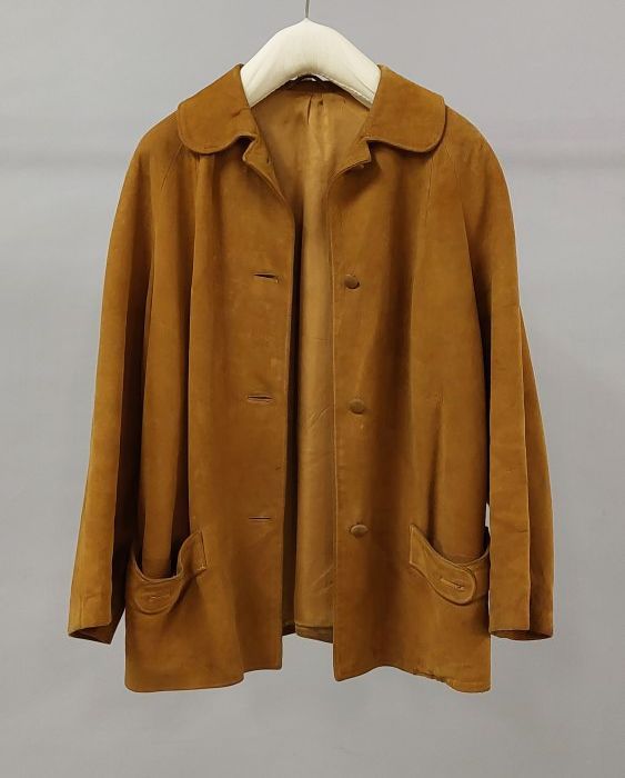 Jas, bruin suède, platte kraag, knoopsluiting midden...