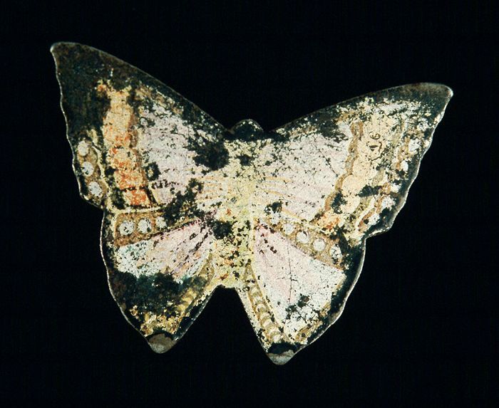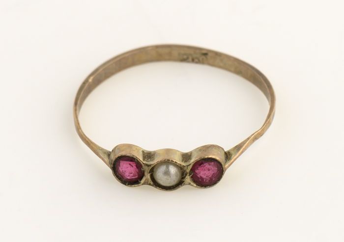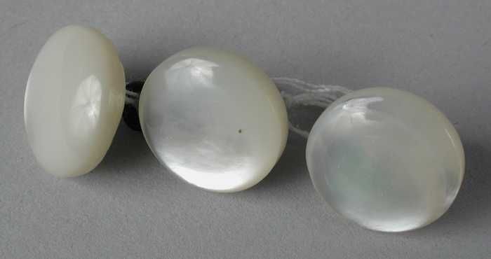Drie kleine parelmoeren rokknopen op een koperen ste...