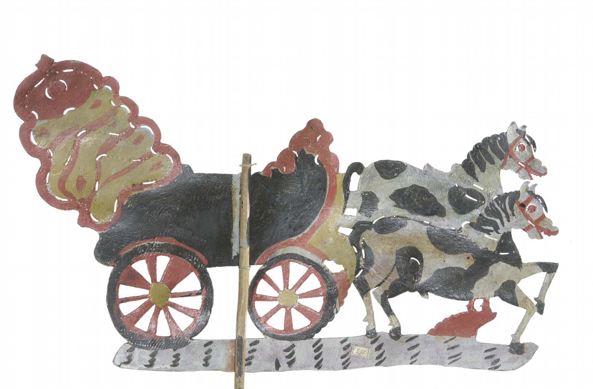 Wajangfiguur Kulit, rijtuig met twee paarden,