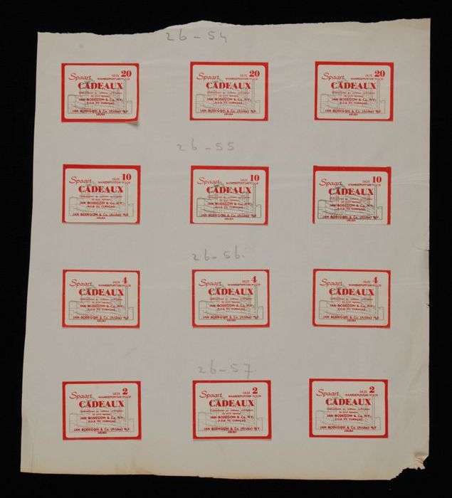Vel papier met twaalf bonnen voor Van Nelle's "CADEAUX"