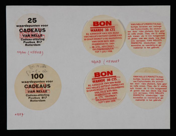 Vel papier met vier bonnen voor Van Nelle's "CADEAUS...