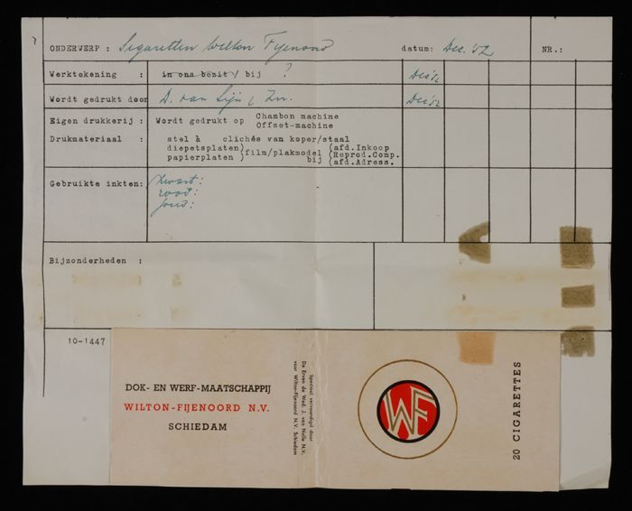 Formulier met opgeplakt pakje sigaretten "Wilton-Fye...