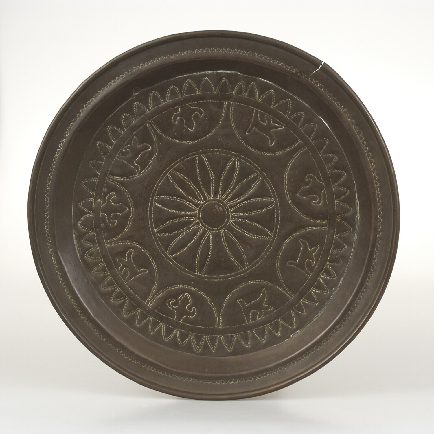 Rond messing presenteerblad met blad- en bloemmotieven