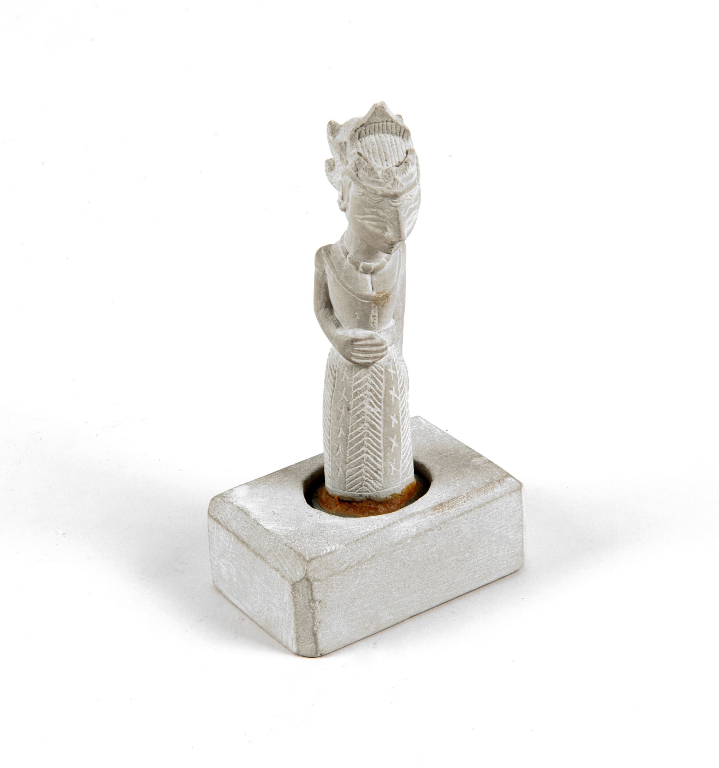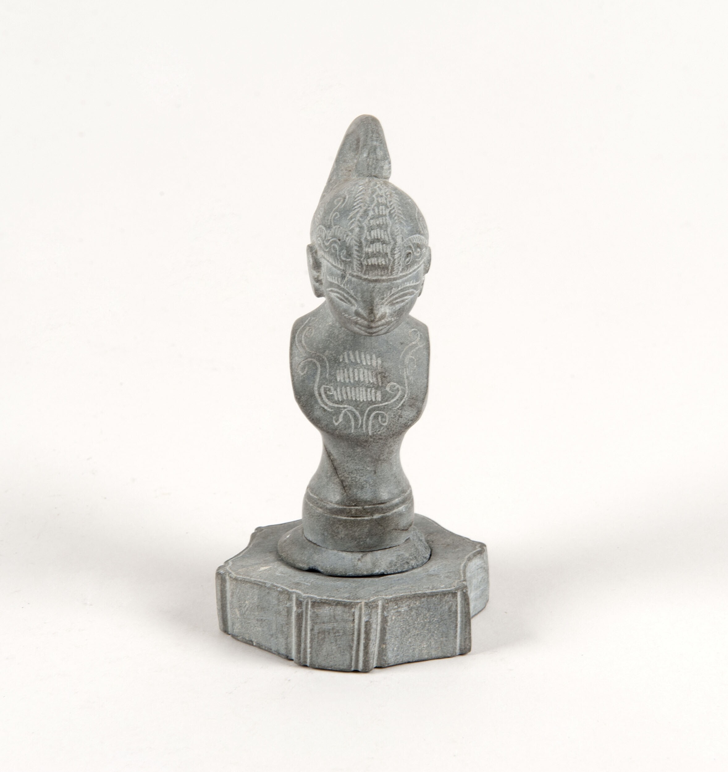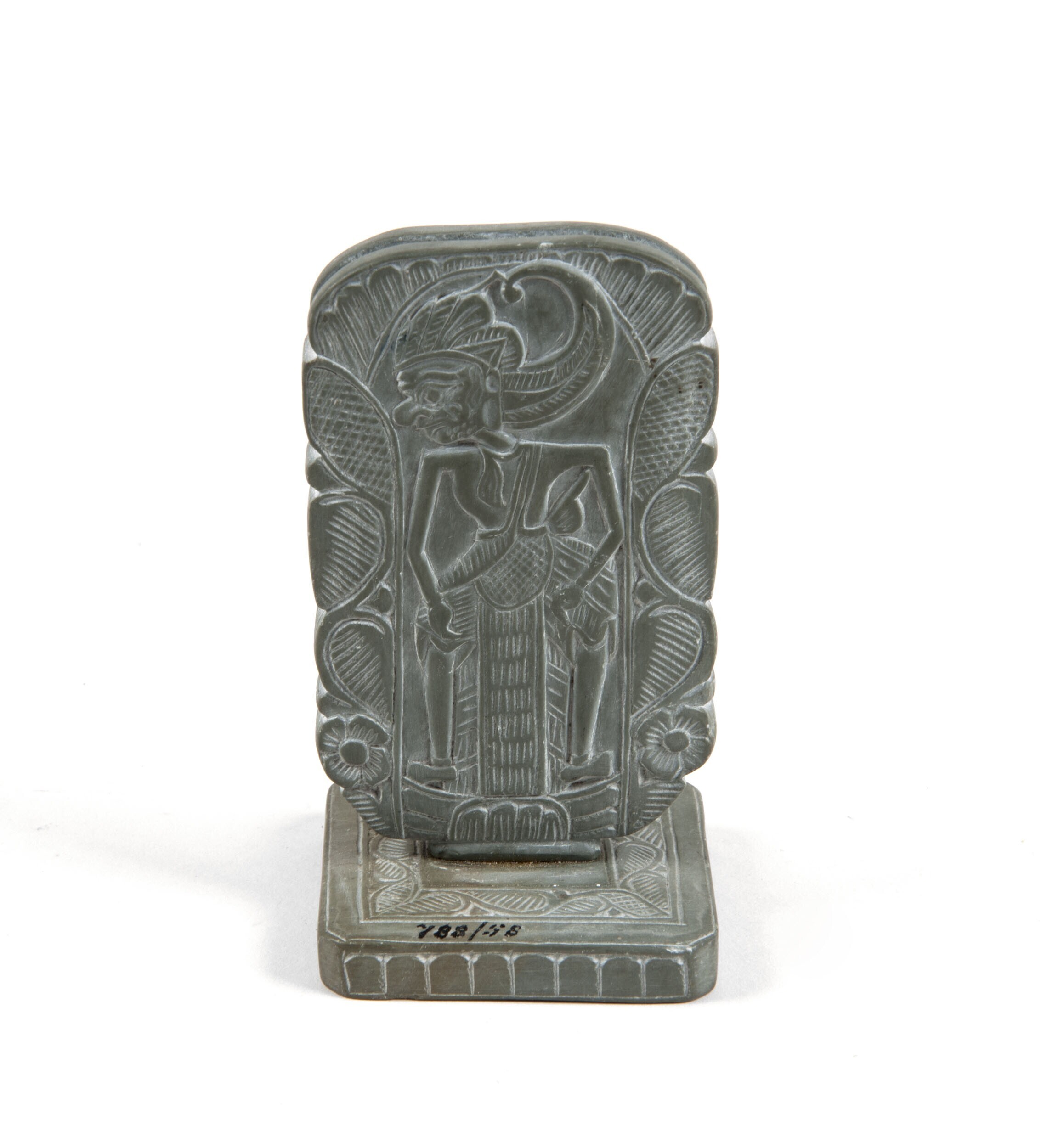 Tweedelig stempel in wayangvorm van blauwgrijze tufs...