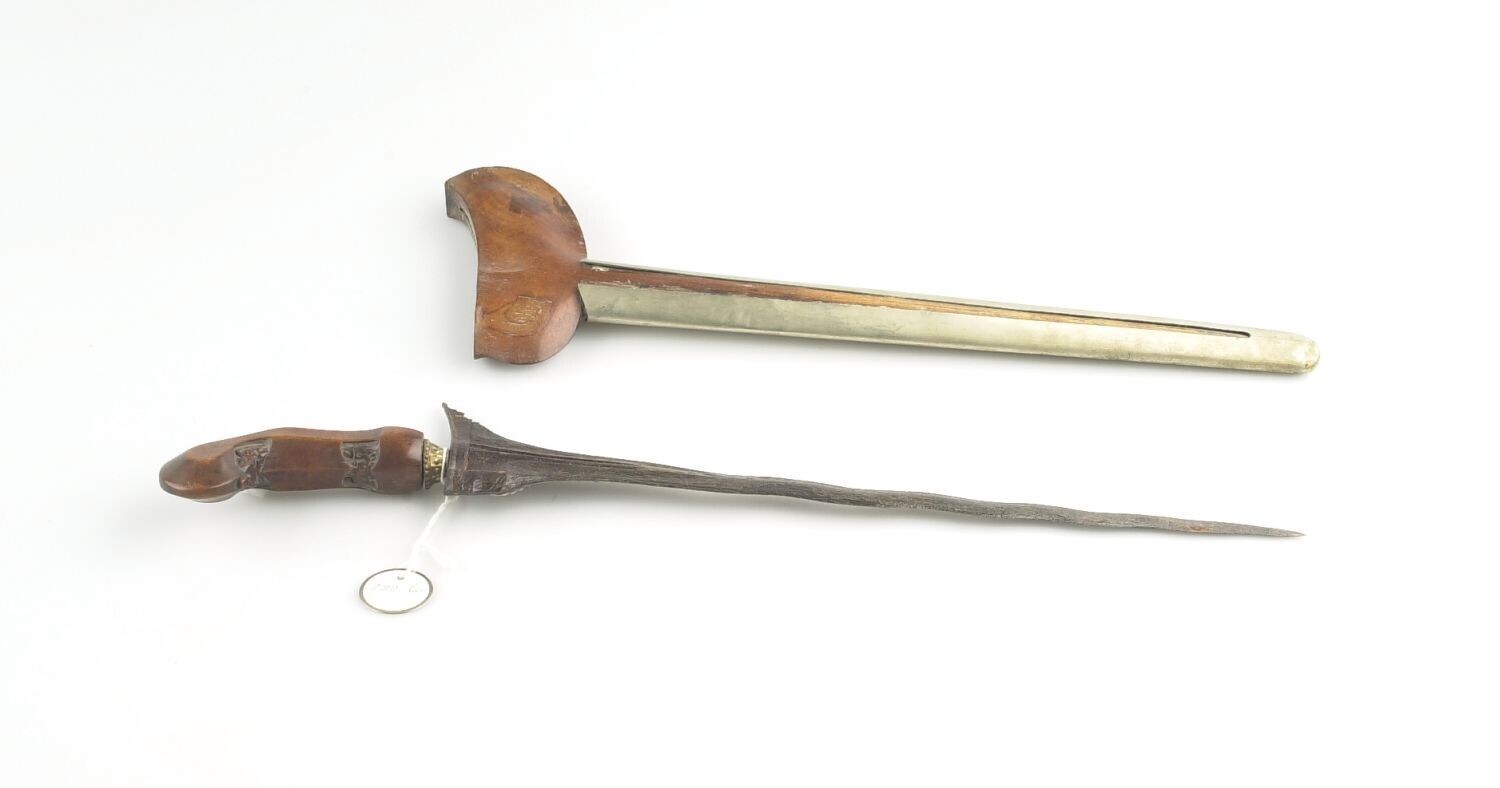 Gegolfde kris met houten greep en houten schede met ...