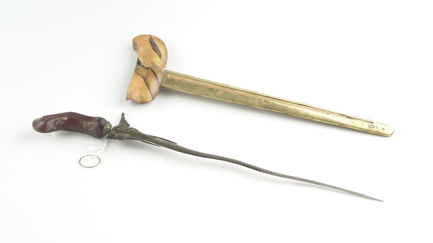 Rechte kris met houten greep en houten schede met ge...