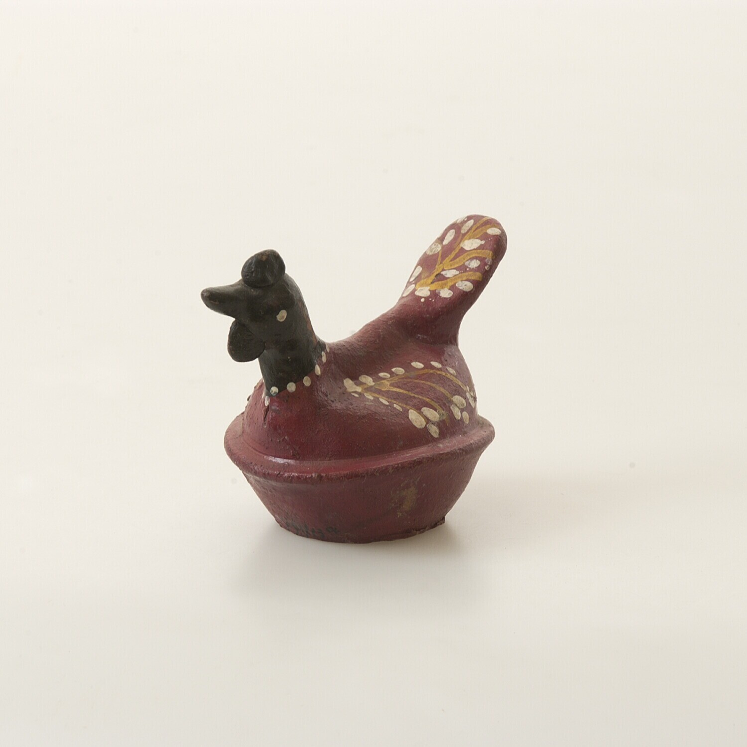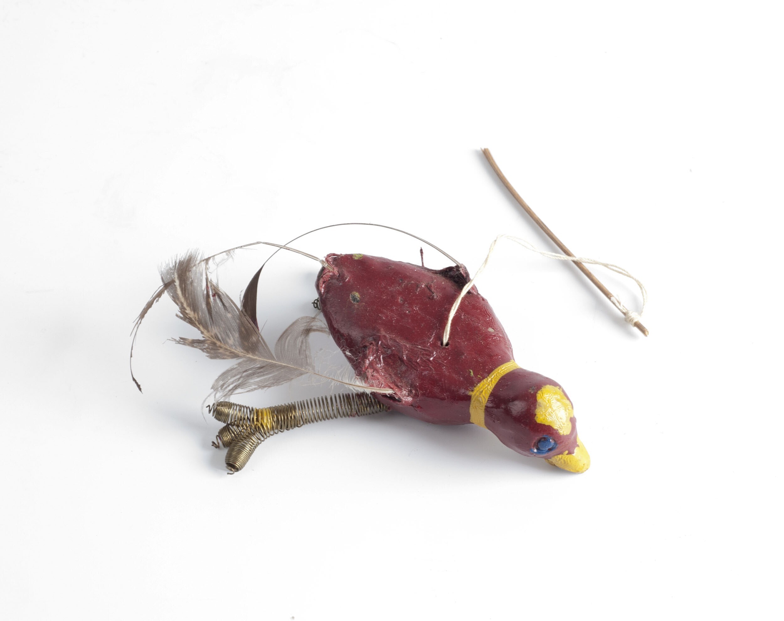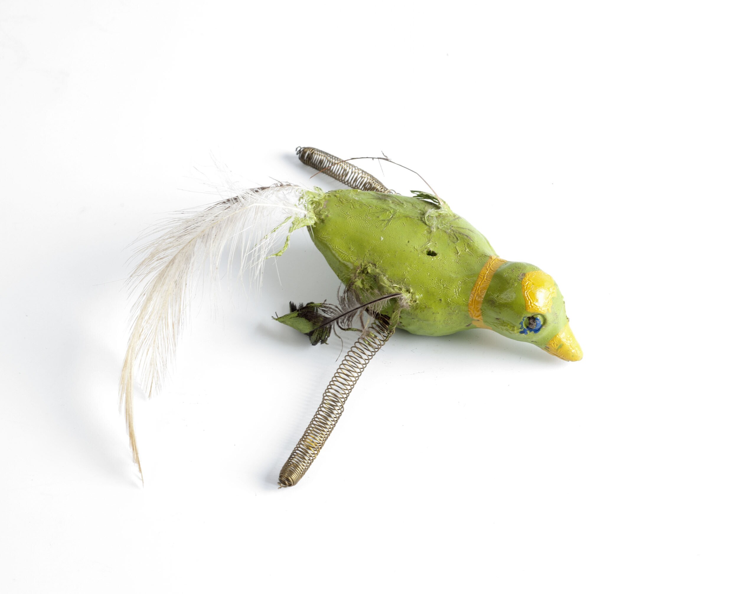 Speelgoedvogel van klei, glas en koper