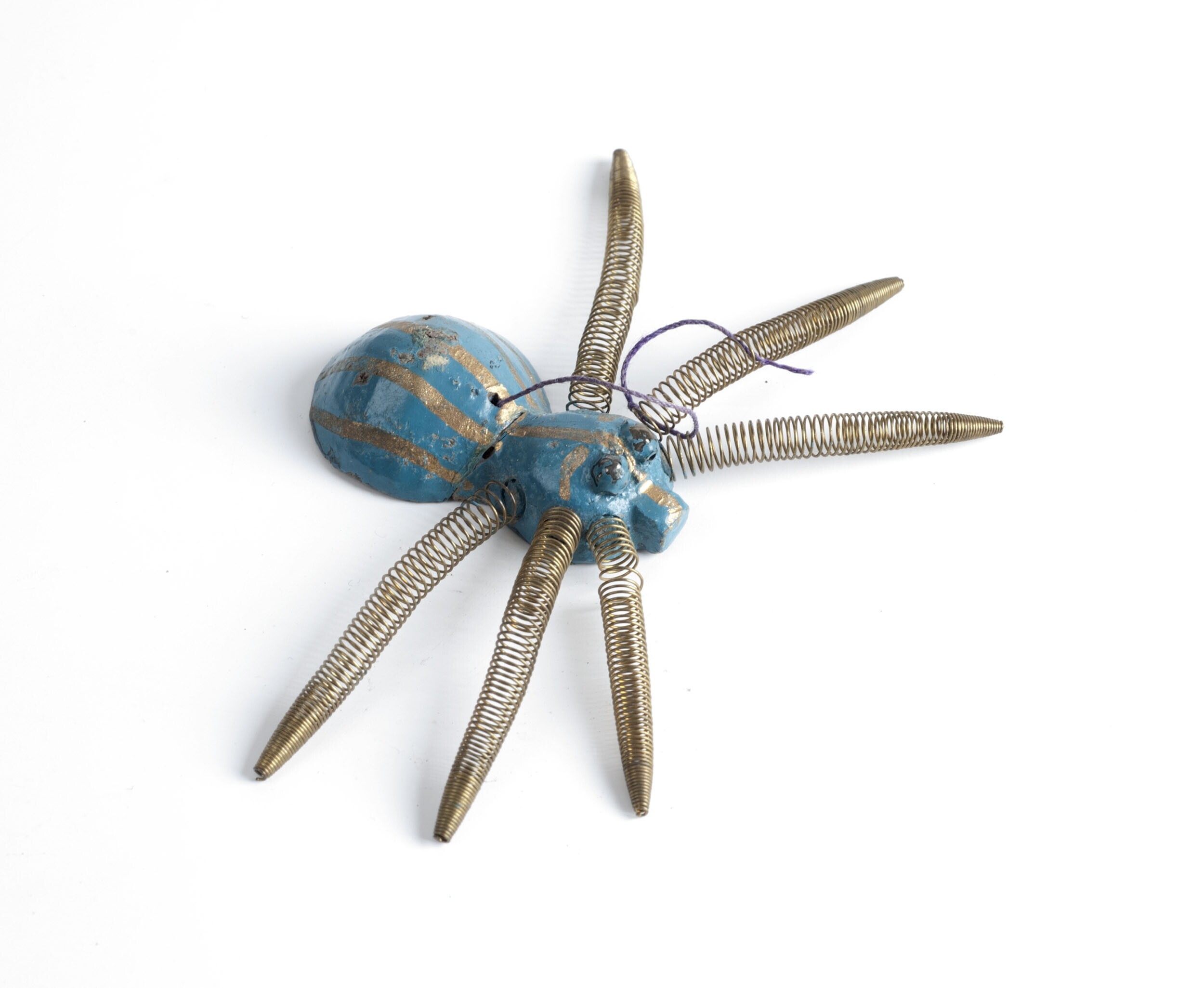 Speelgoedspin van klei, glas en koper