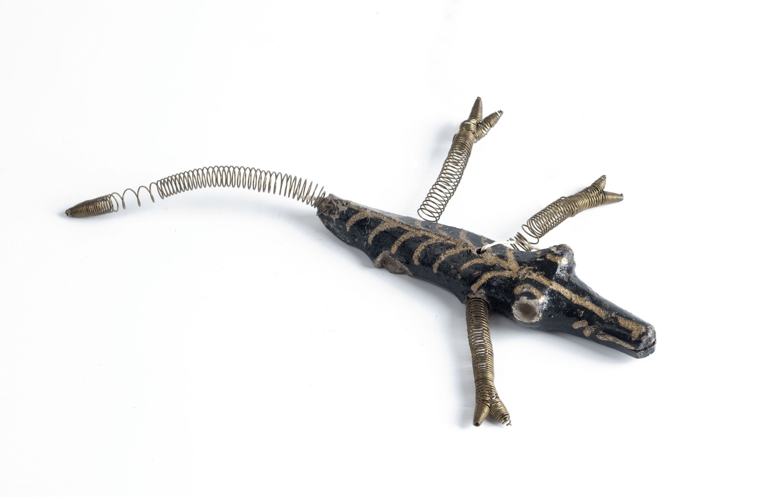 Speelgoedkrokodil van klei, glas en koper