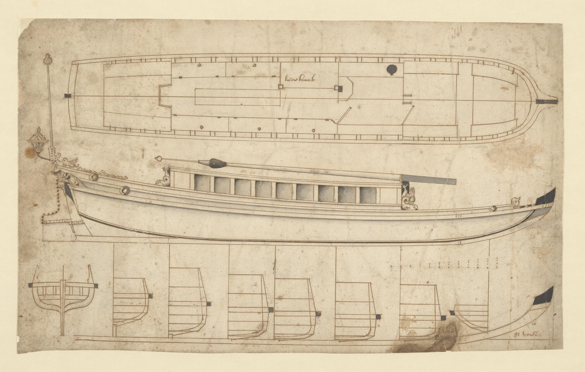 Verticale langsdoorsnede, bovenaanzicht, spantenraam...