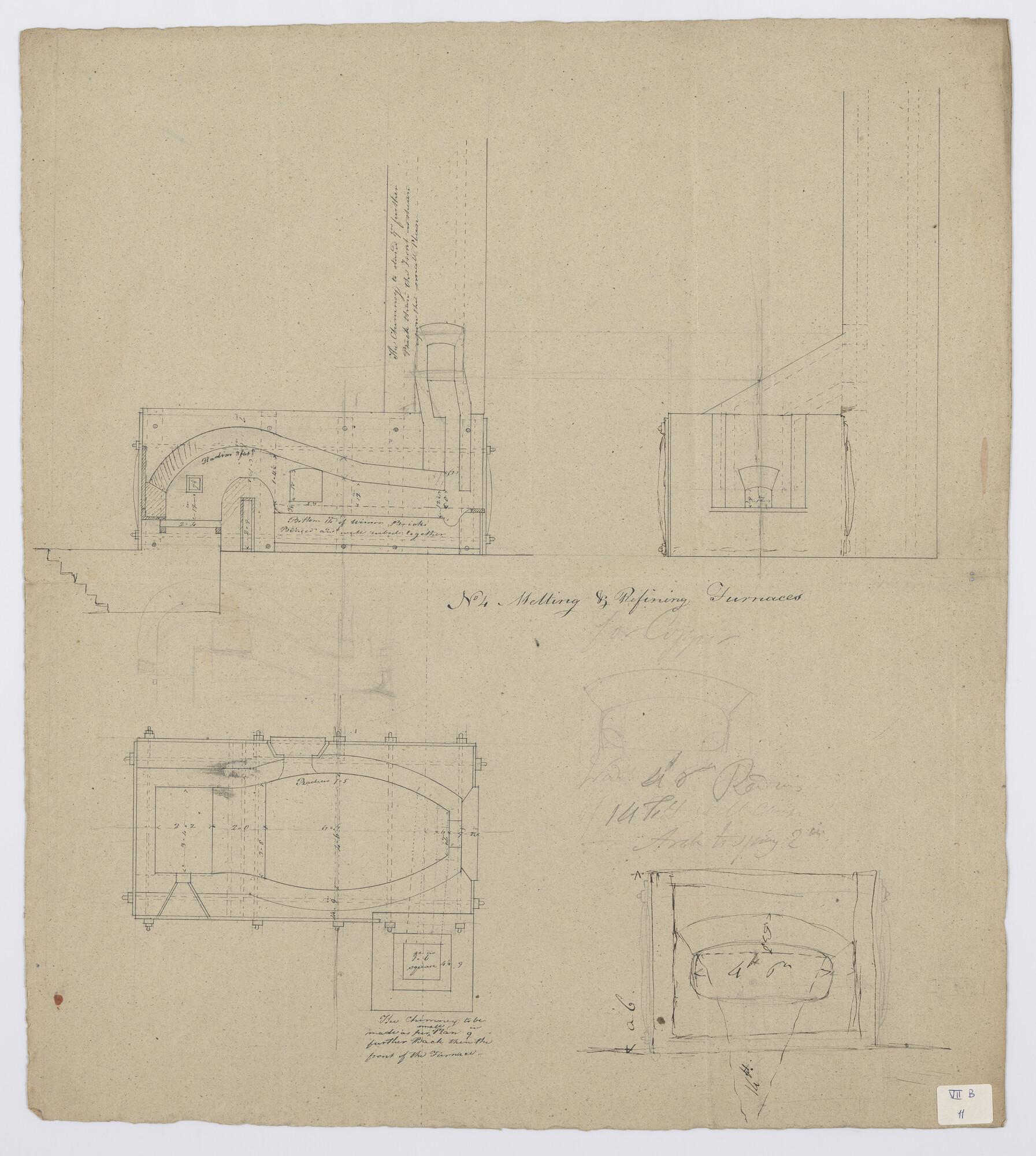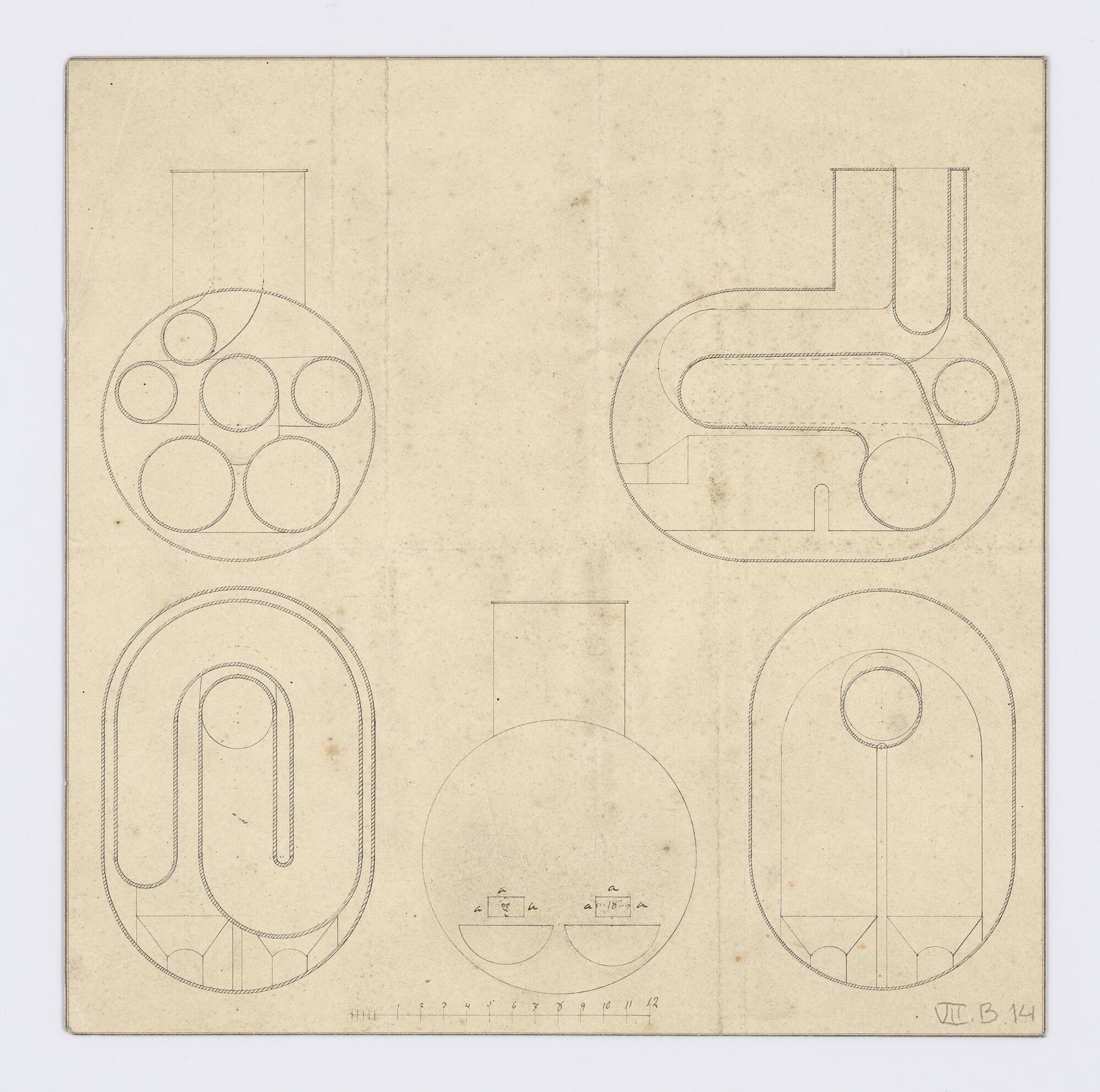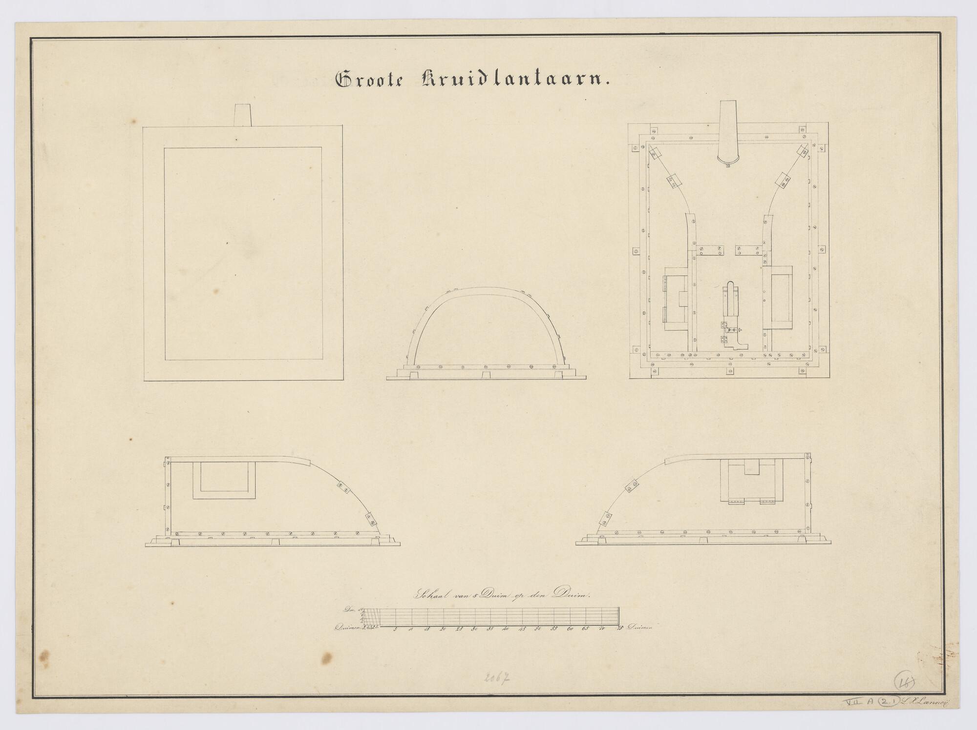 Verticale langsdoorsnede, bovenaanzicht en dwarsdoor...