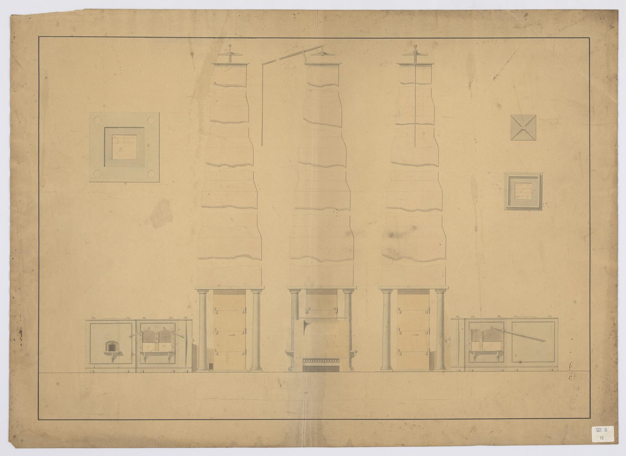Verticale langsdoorsnede, dwarsdoorsnede en vooraanz...