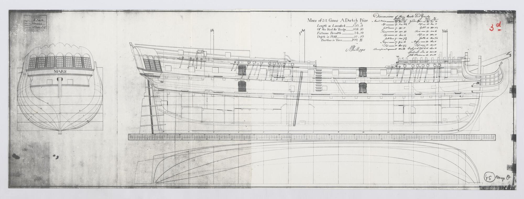 Oorlogsschip Helder: achteraanzicht, spantenraam en ...