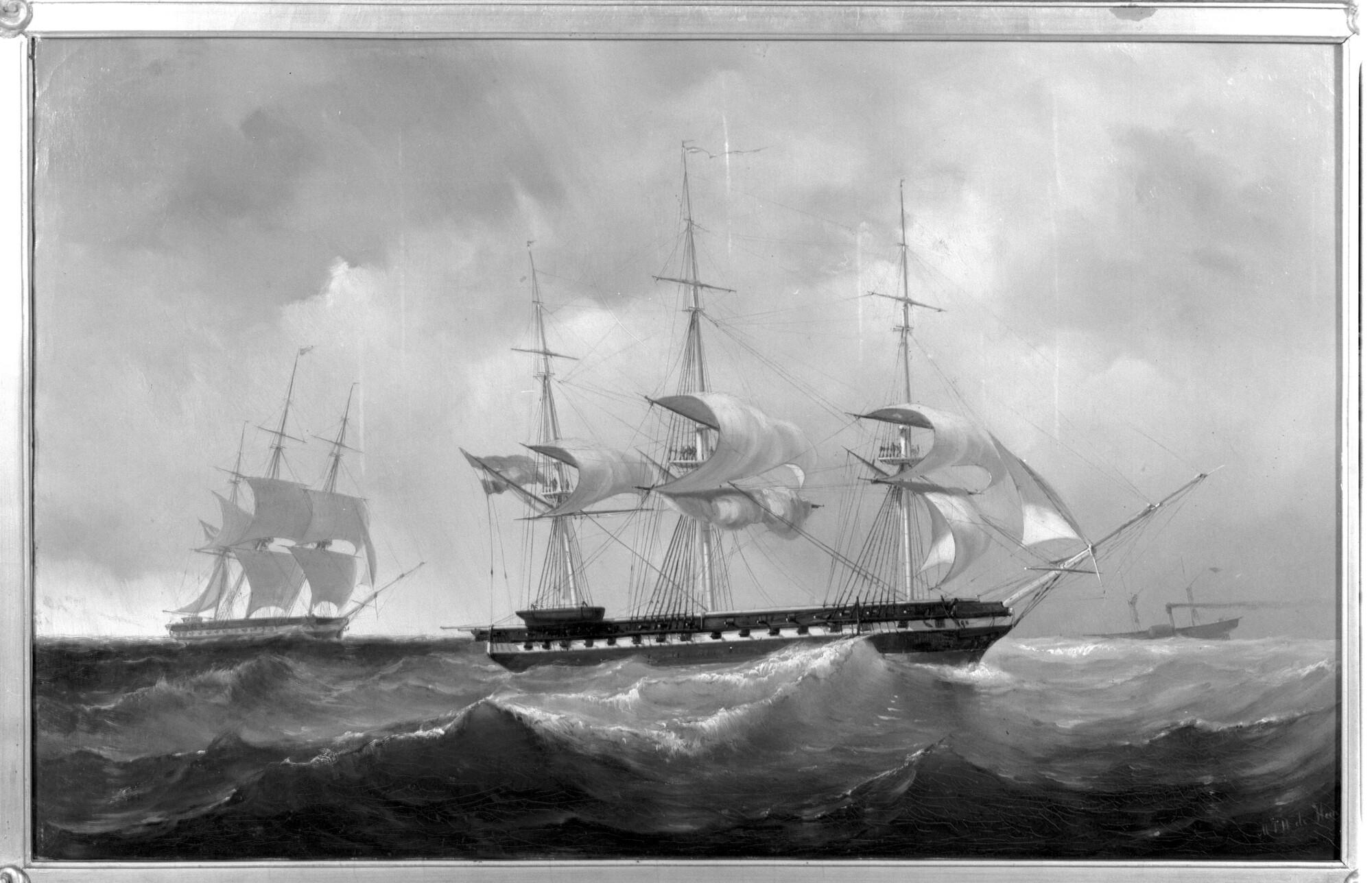 Het fregat Zr.Ms. Rijn op volle zee voor de wind zei...
