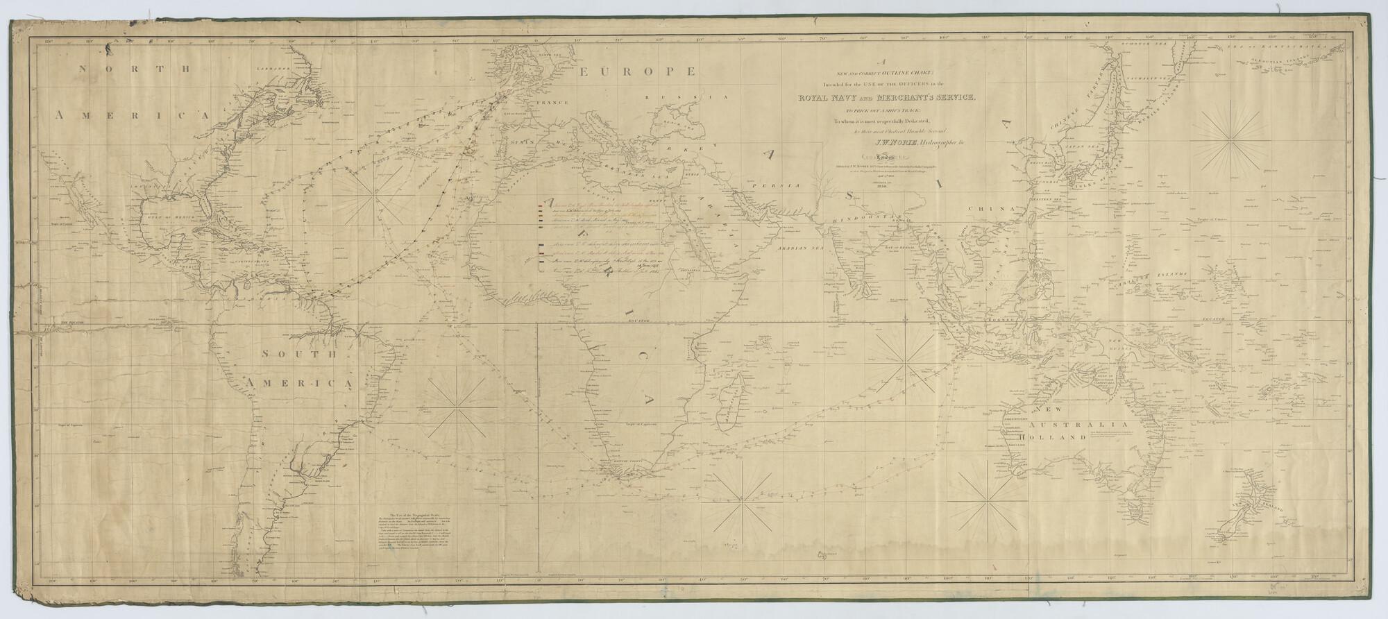 Zeekaart op linnen geplakt, waarop zijn bijgehouden ...