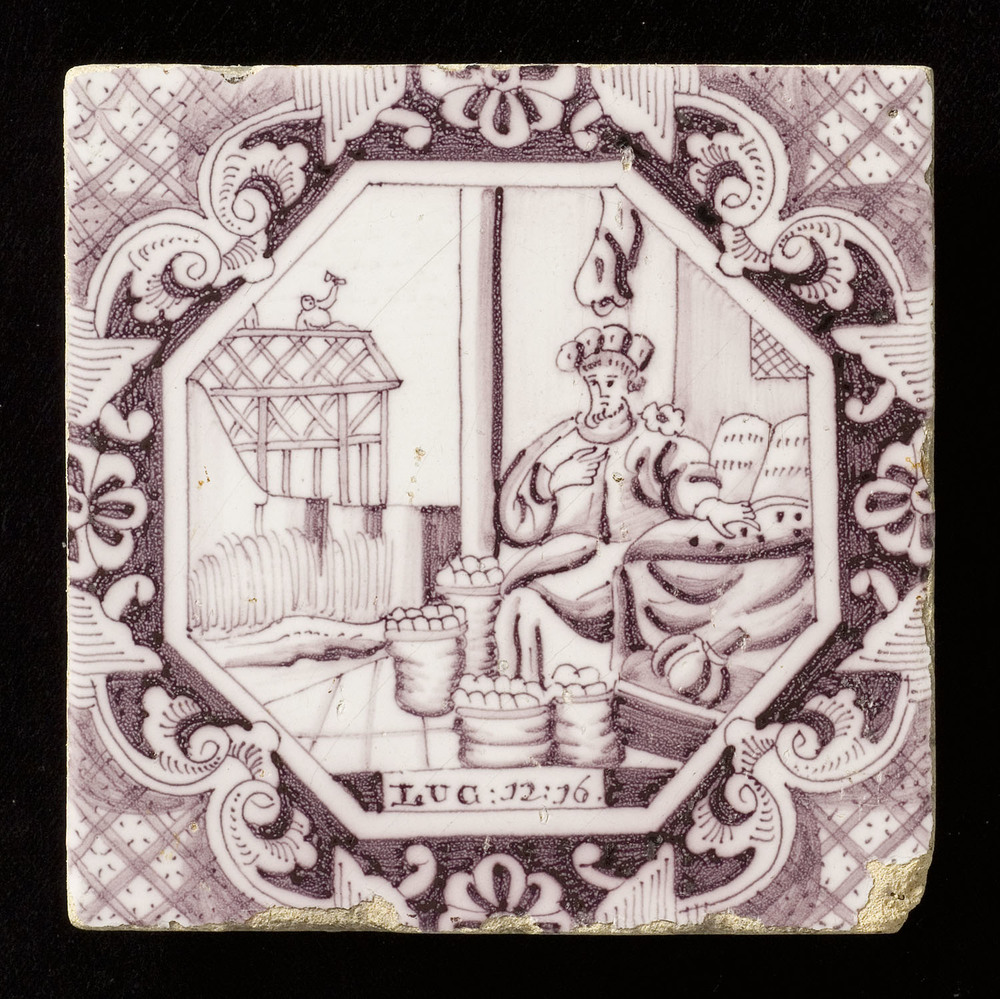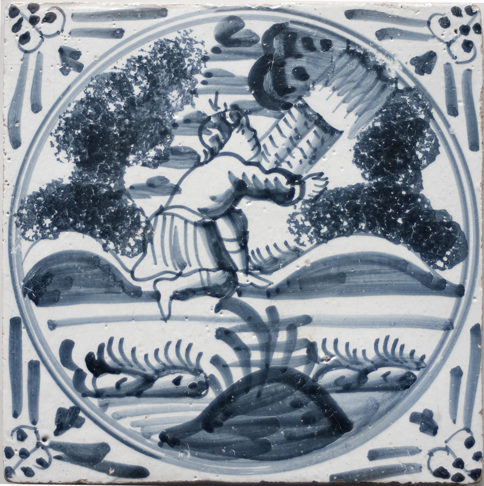 Tegel van keramiek met tinglazuur, voorstellende: De...