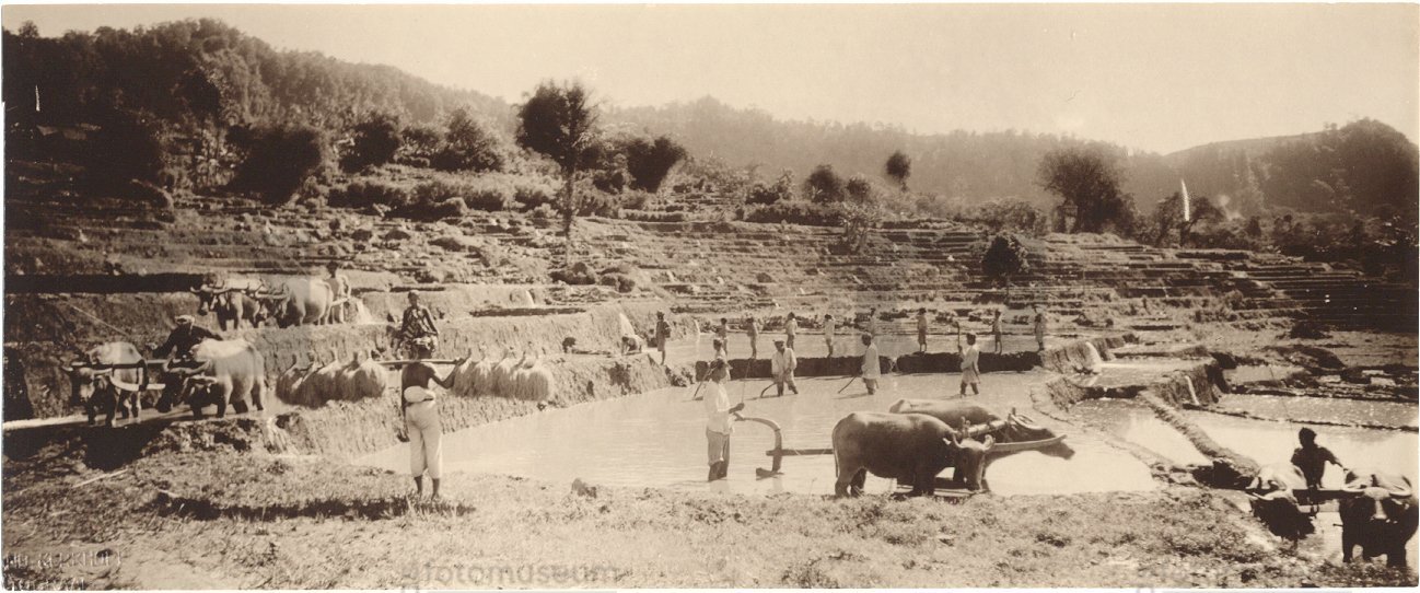 Ploegen van een rijstveld, Cianjur, Java, Indonesië ...