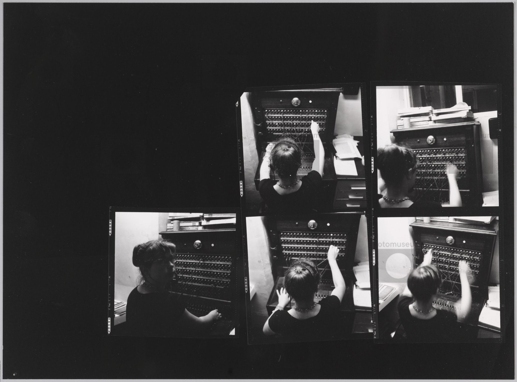 Telefoniste achter telefooncentrale, gebouw Felix Me...