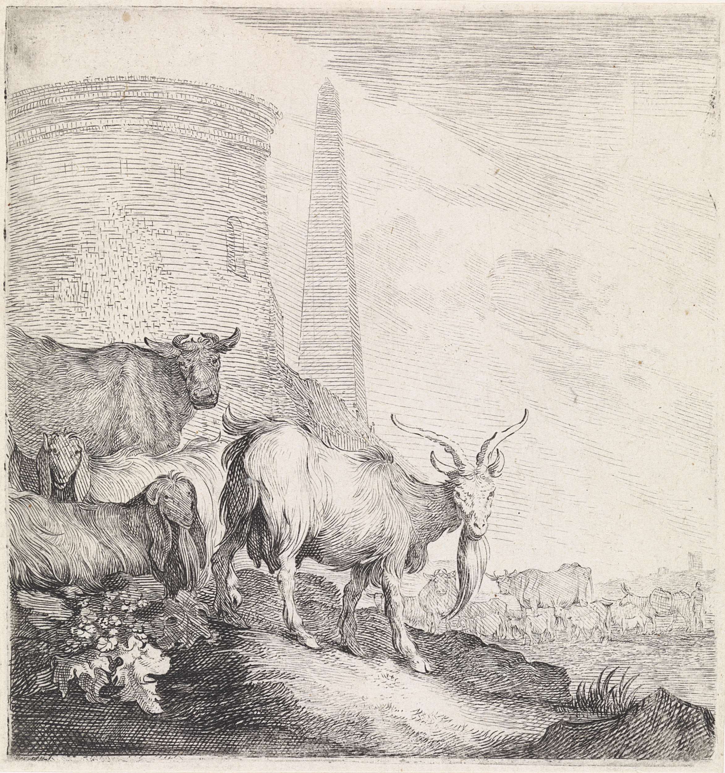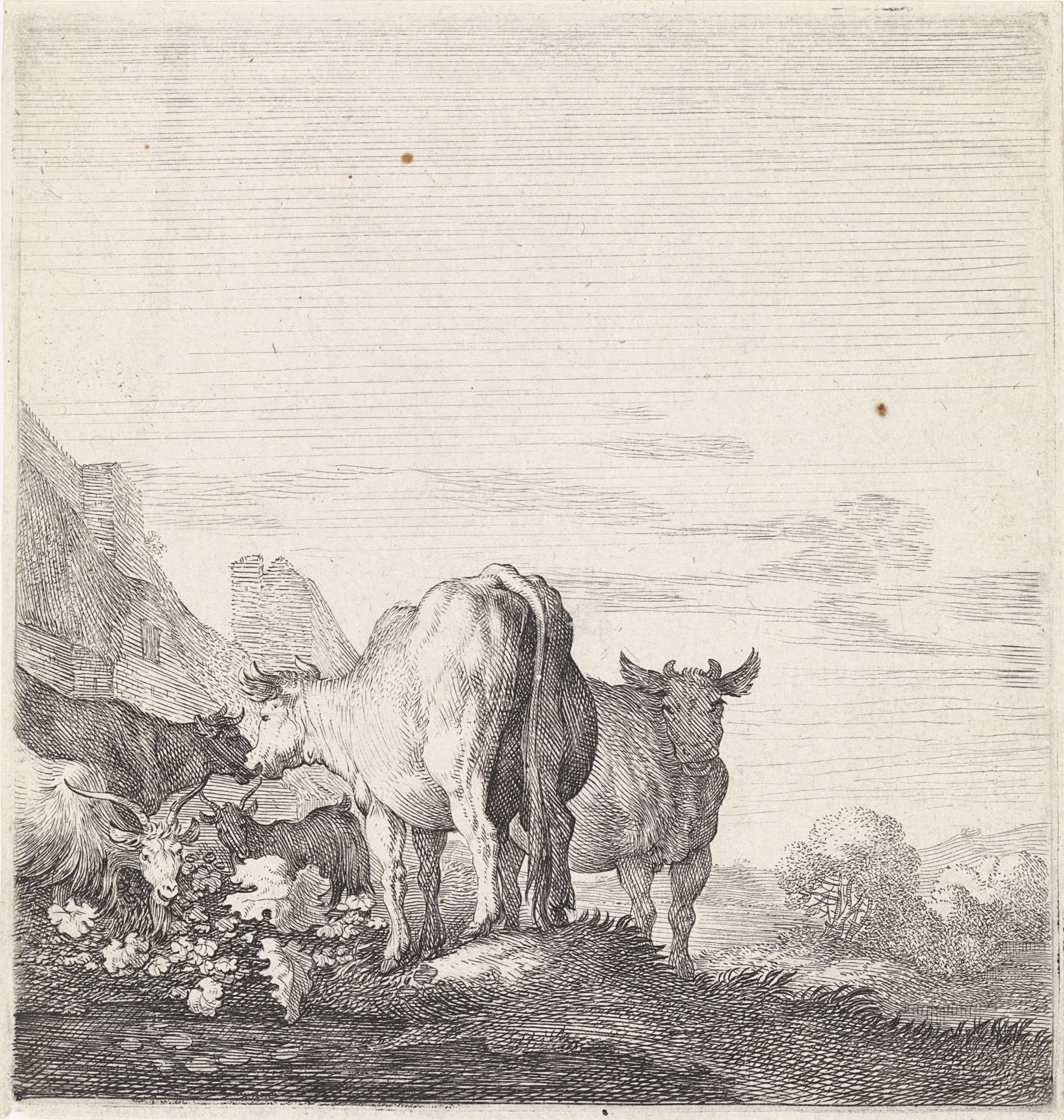 Twee paarden met geiten en een koe bij een hoge (sta...