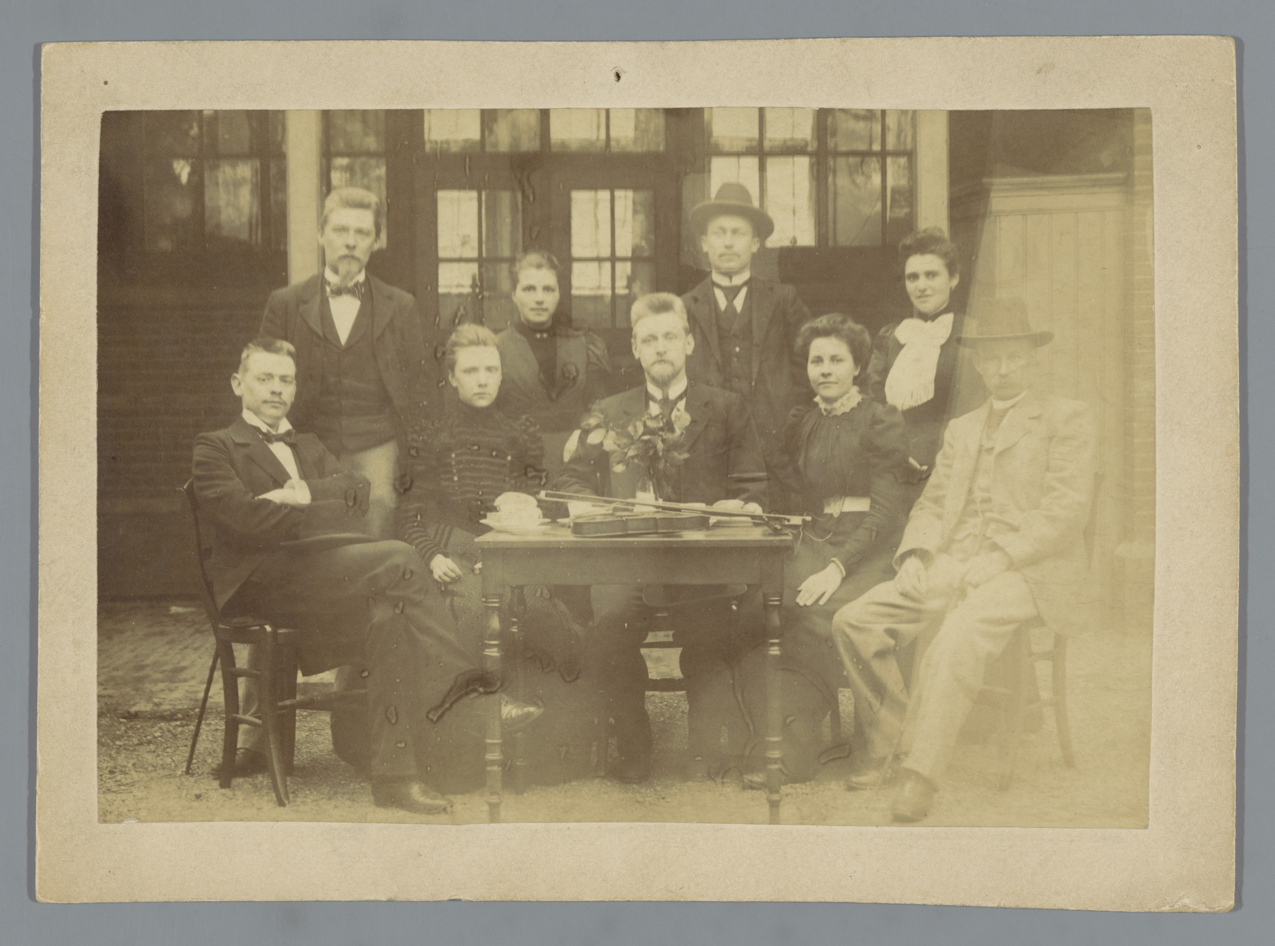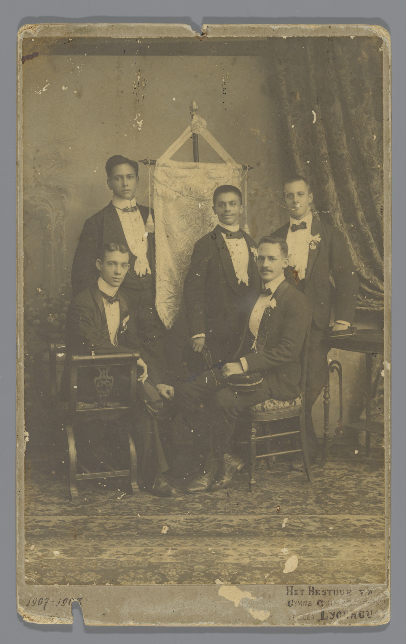 Groepsportret van vijf onbekende mannen in werkkledi...