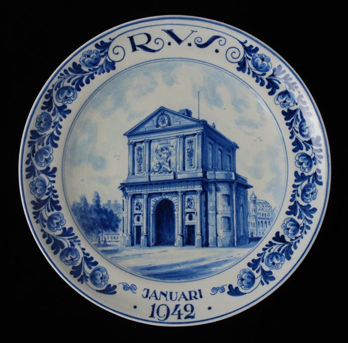 Delfts Schoonhoven wandbordje met blauw wapen Rotter...